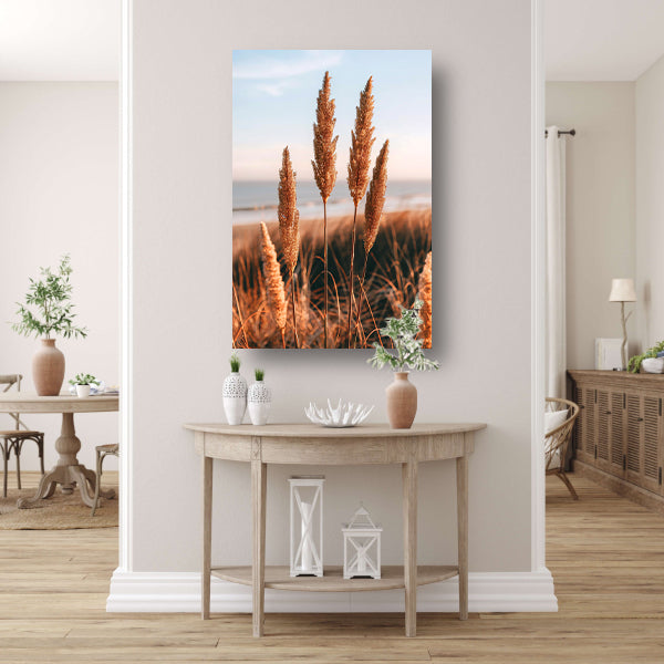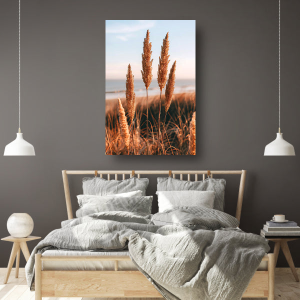 Gouden Grashalmen bij Zee in Zonsondergang canvas