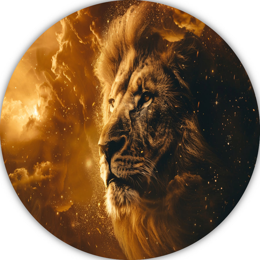 Gouden leeuw omringd door vurige gloed aluminium muurcirkel
