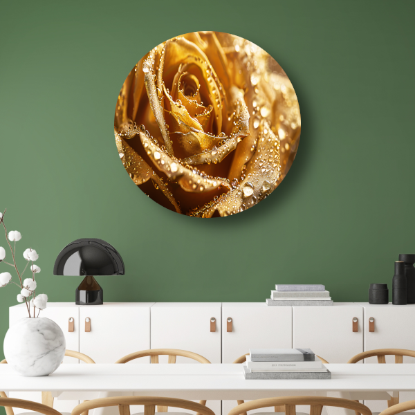 Gouden roos bedekt met glinsterende dauwdruppels aluminium muurcirkel