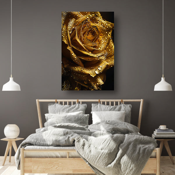 Gouden roos met fonkelende waterdruppels close-up poster