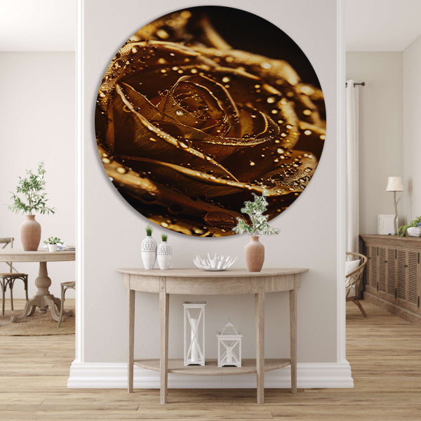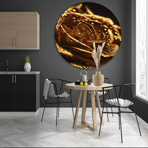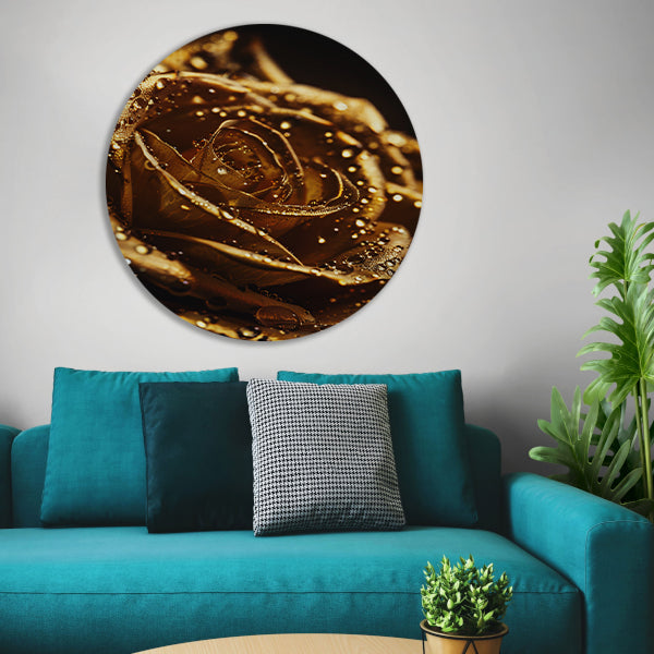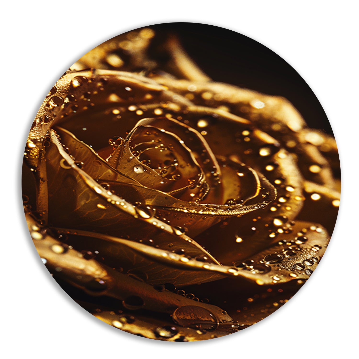 Gouden roos met glinsterende dauwdruppels close-up aluminium muurcirkel