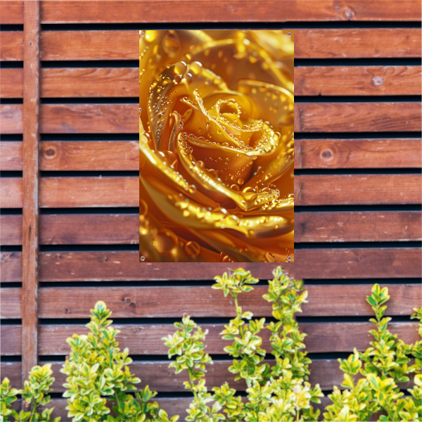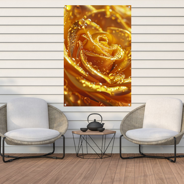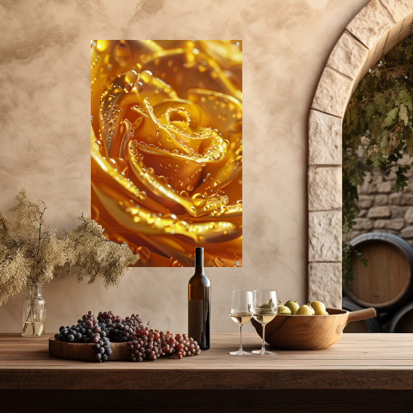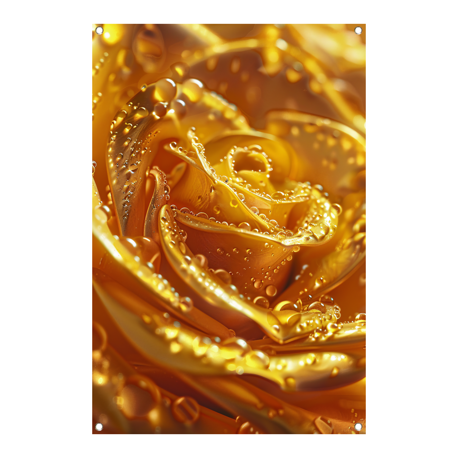 Gouden roos met glinsterende waterdruppels close-up tuinposter