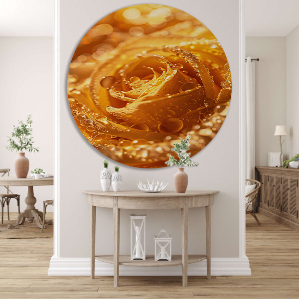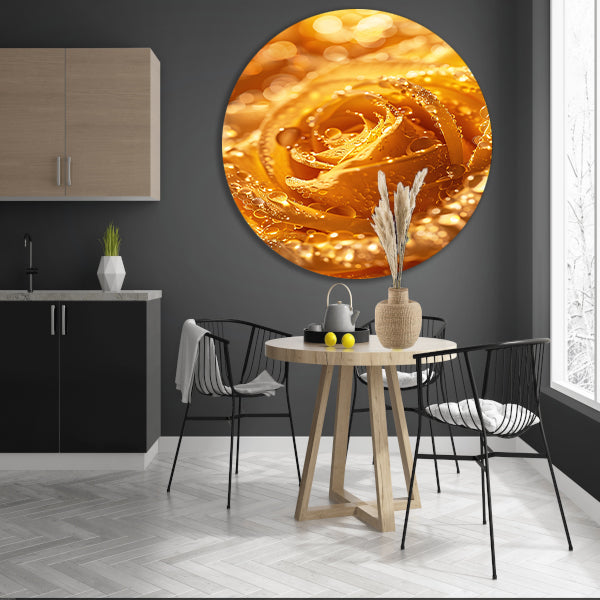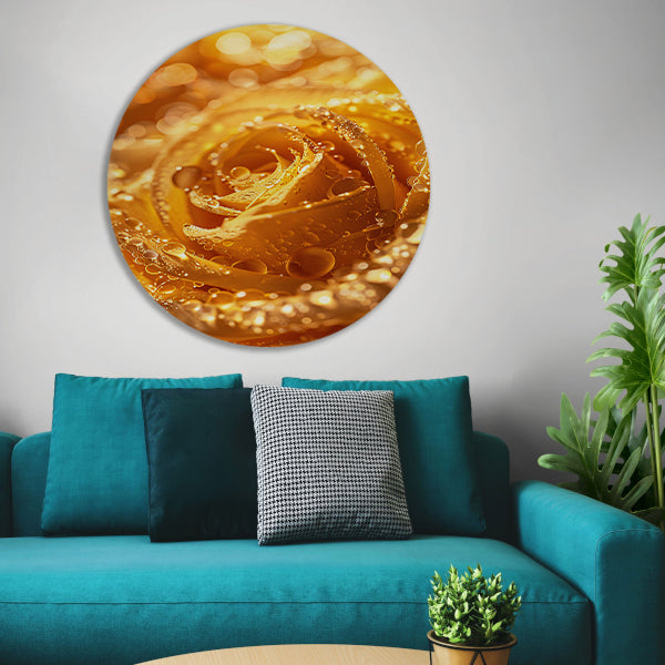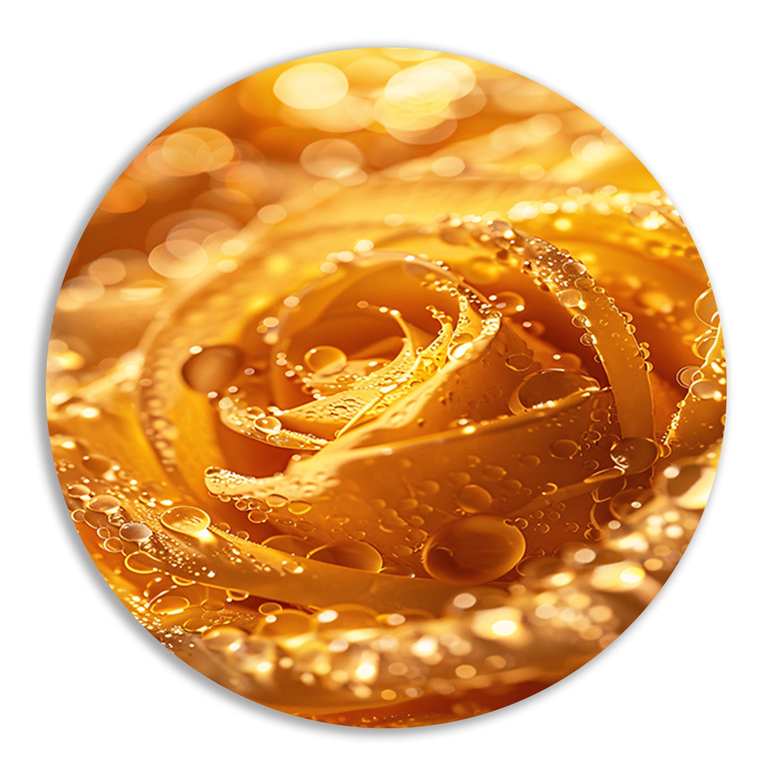 Gouden Roos Versierd met Fonkelende Waterdruppels aluminium muurcirkel