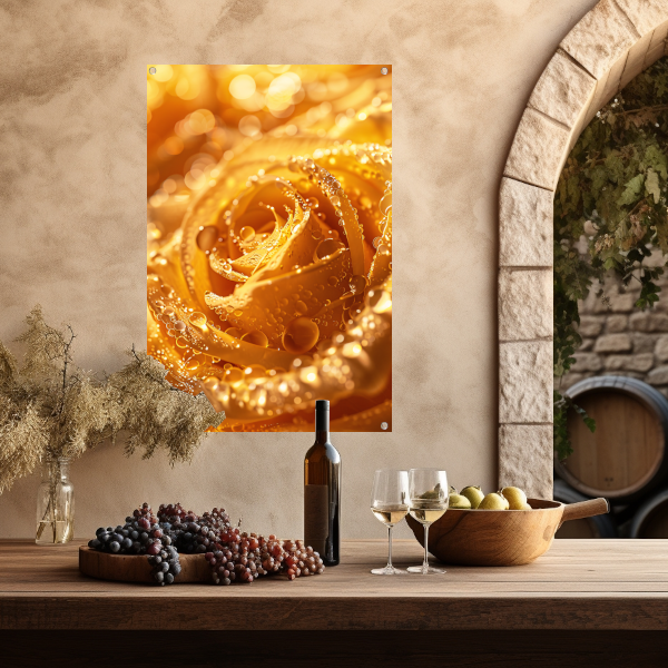 Gouden Roos Versierd met Fonkelende Waterdruppels tuinposter