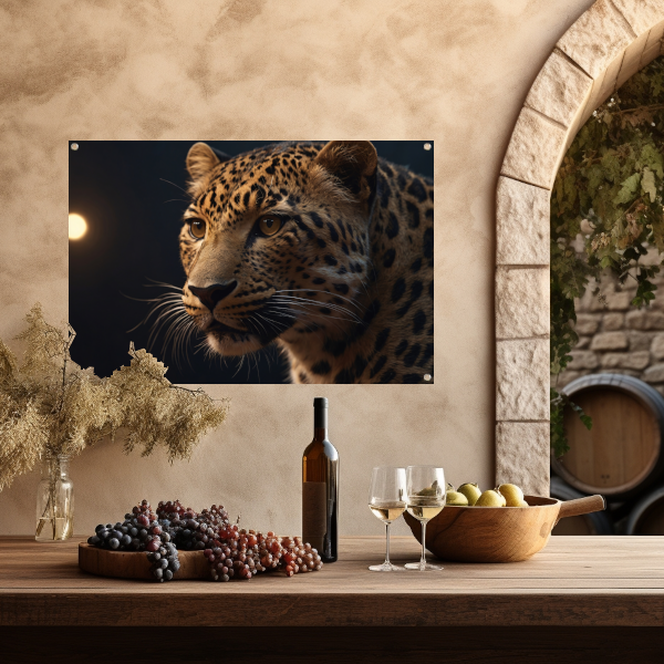De stijl van deze tuinposter is modern en artistiek. Het luipaardportret is gedetailleerd en realistisch weergegeven, waardoor het lijkt alsof het dier echt in jouw tuin aanwezig is. Het gouden schemerlicht geeft de poster een unieke en bijzondere uitstraling.
