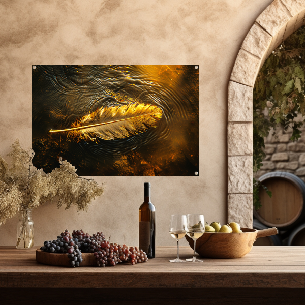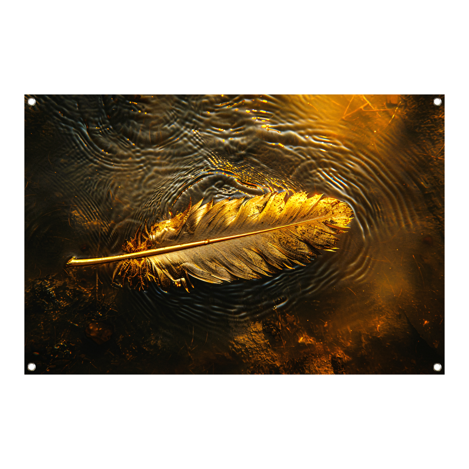 Gouden veer drijvend op een waterige zonsondergang tuinposter