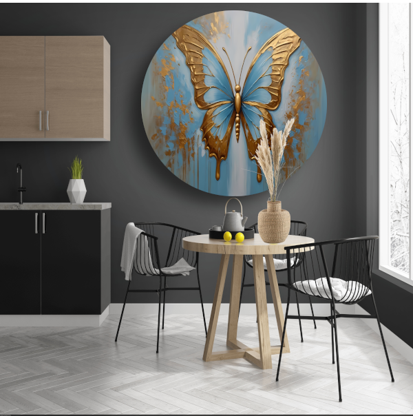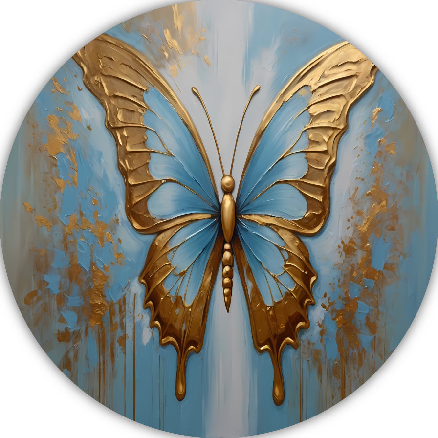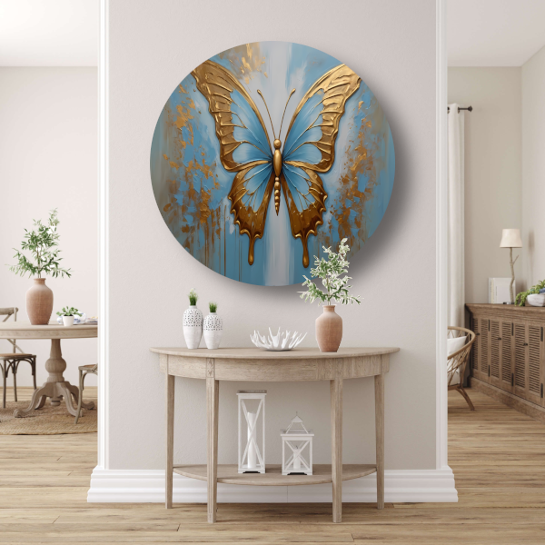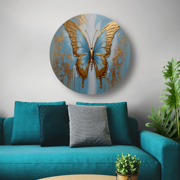Gouden Vlinder tegen Hemelsblauwe Achtergrond aluminium muurcirkel