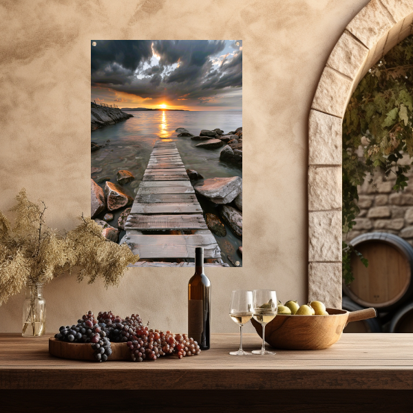 Gouden zonsondergang met dramatische wolken en steiger tuinposter