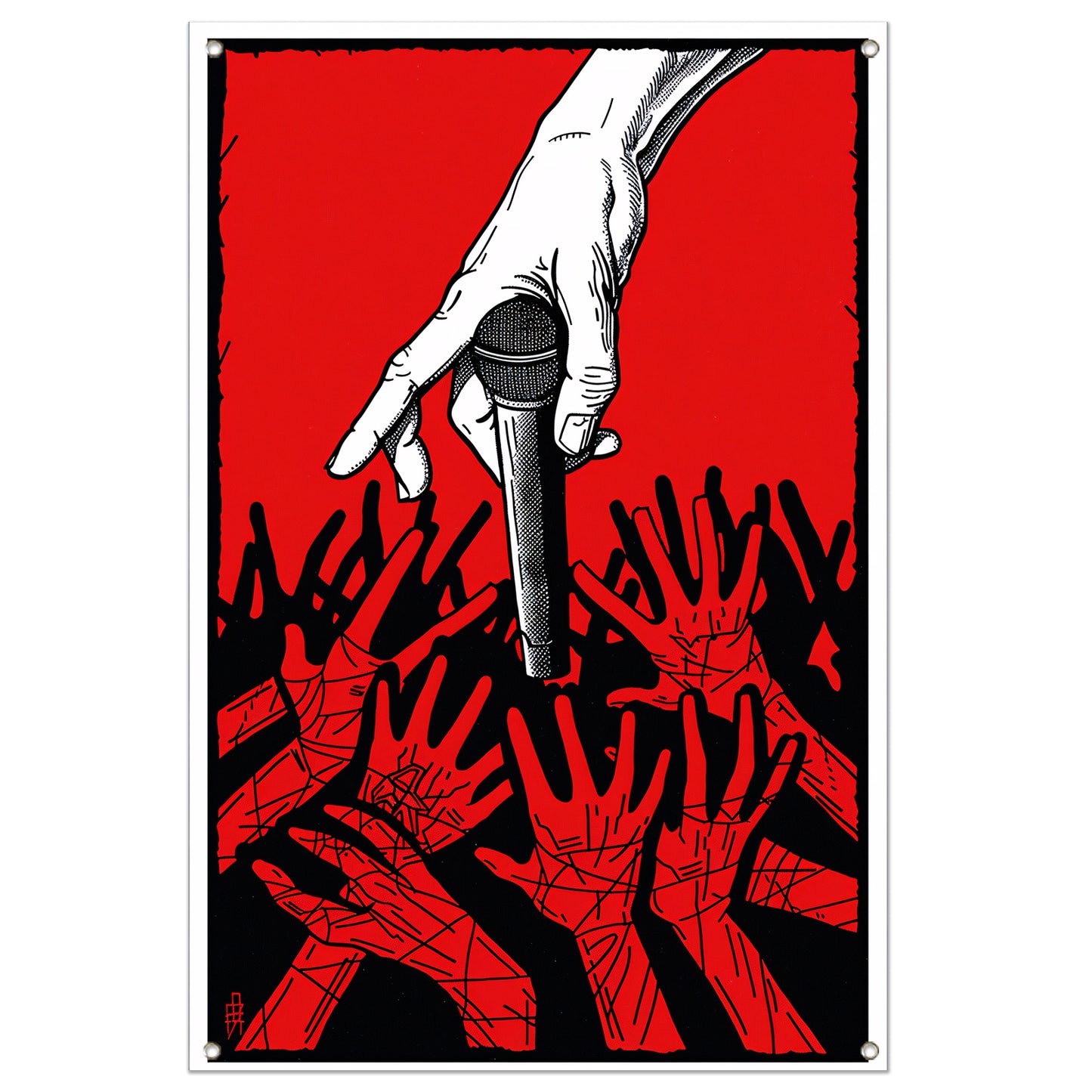 Hand houdt microfoon omhoog tussen andere handen. tuinposter