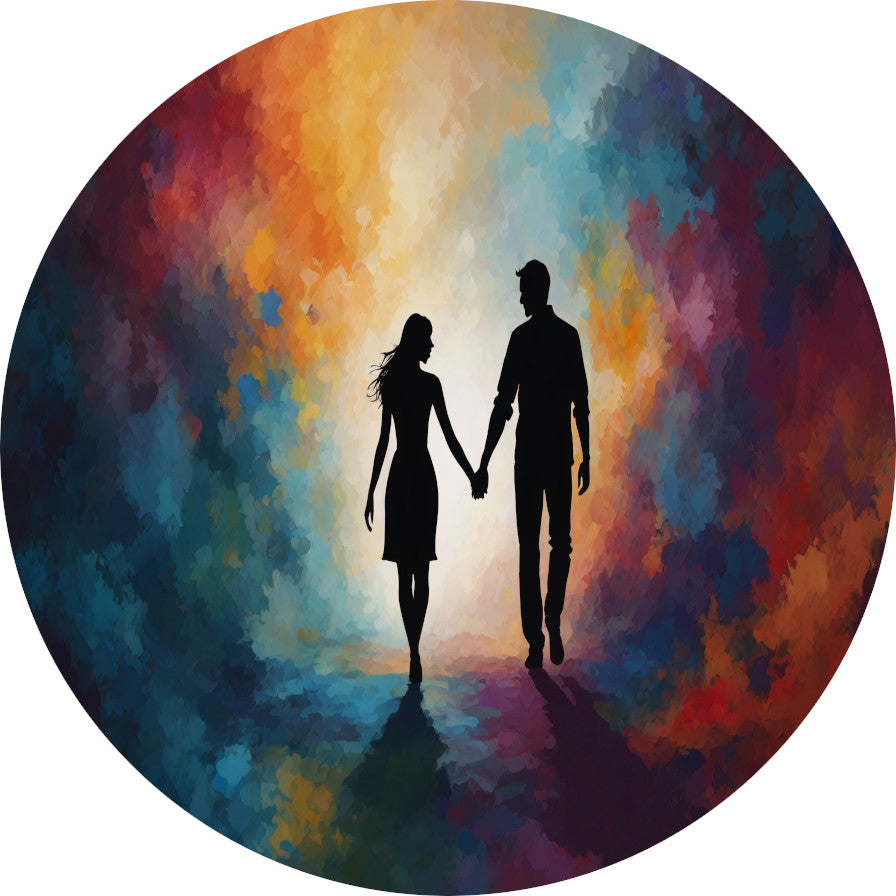 Hand in Hand: Silhouet tegen Kleurenpracht aluminium muurcirkel