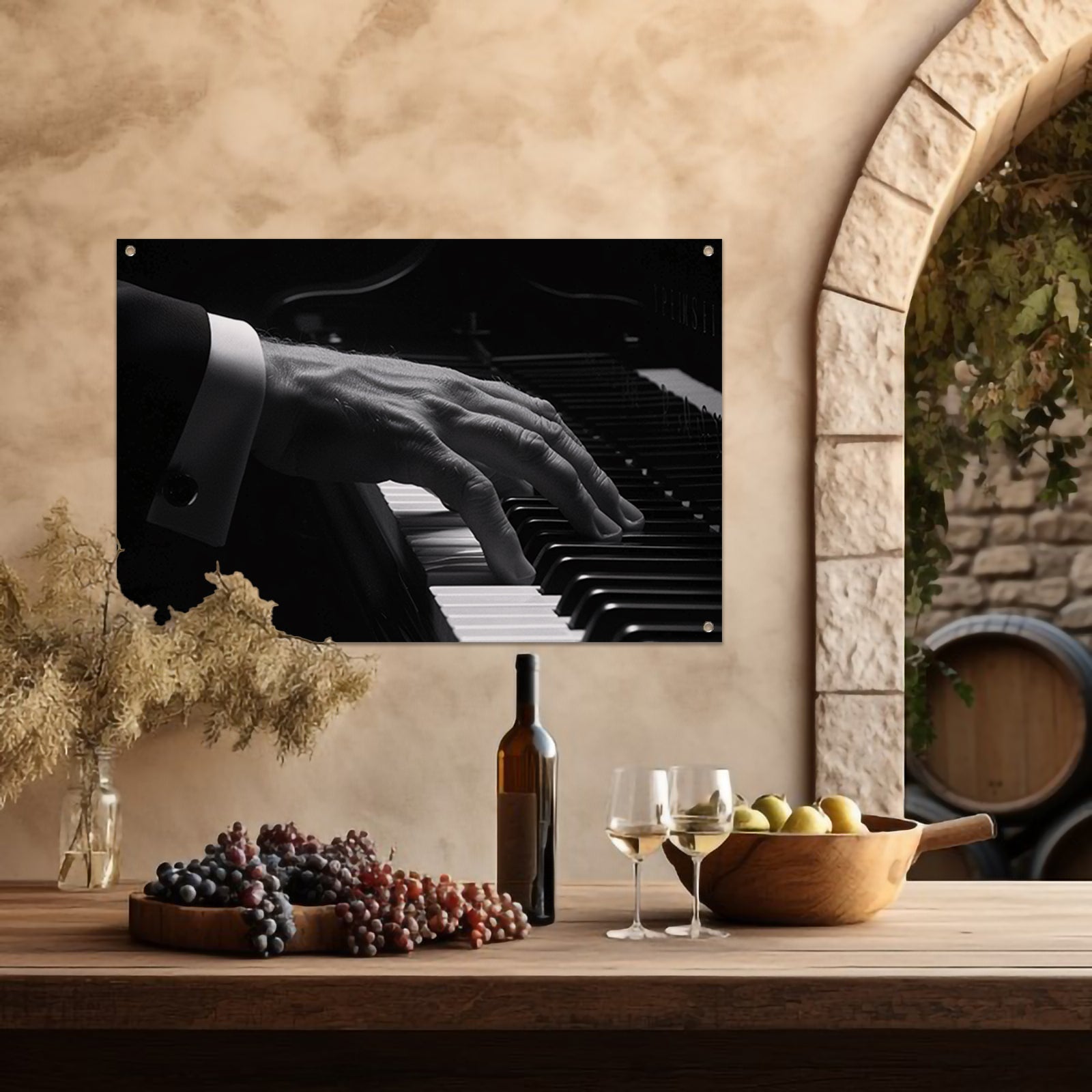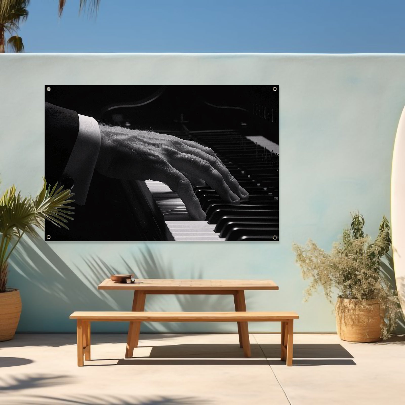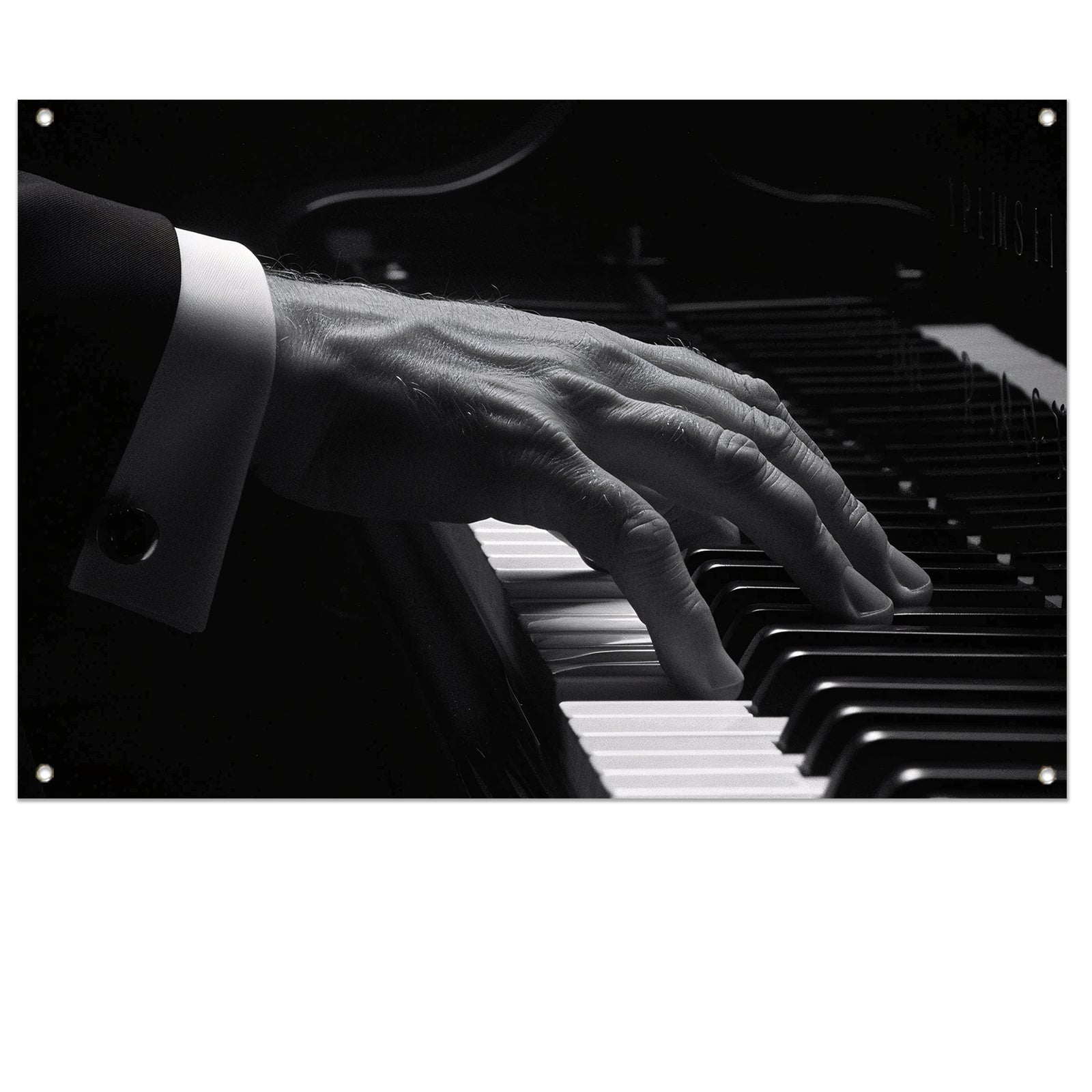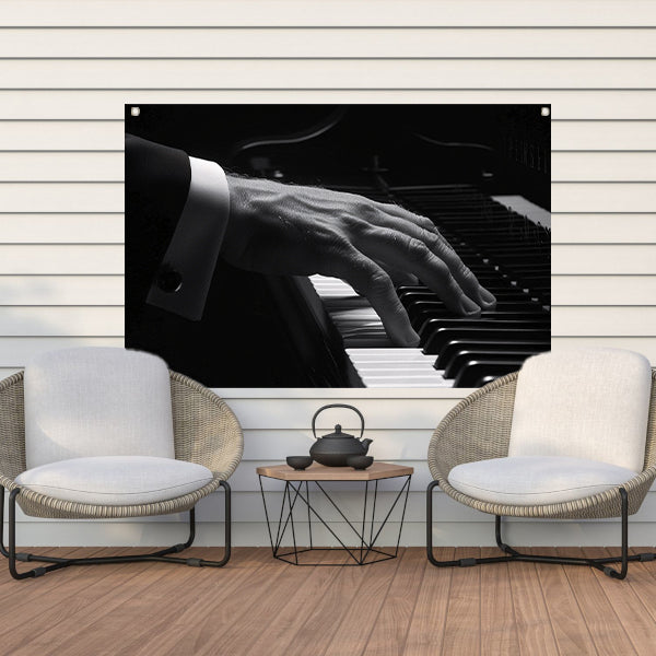 Hand speelt piano in zwart-wit foto tuinposter