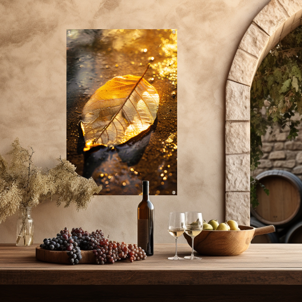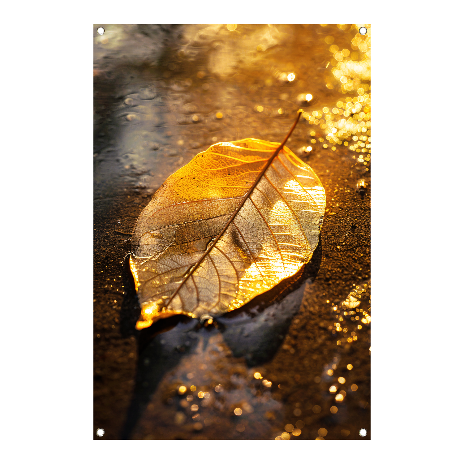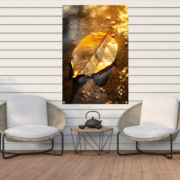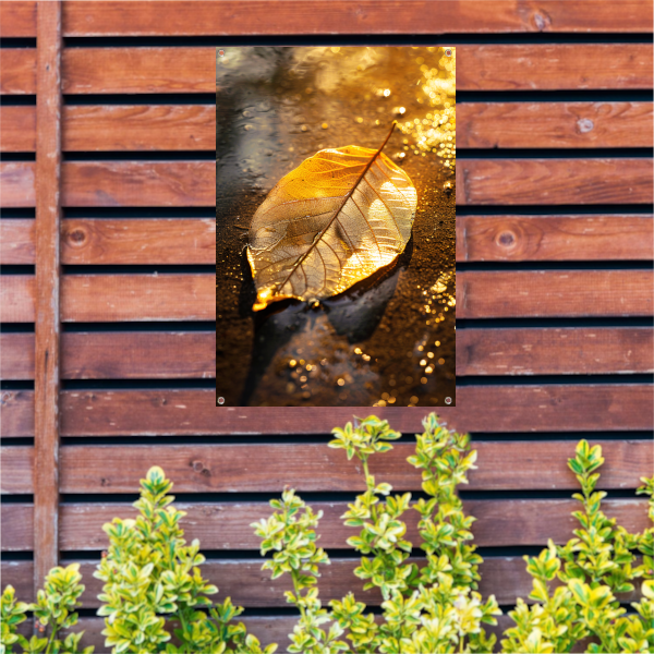 Herfstblad in gouden licht op natte ondergrond tuinposter