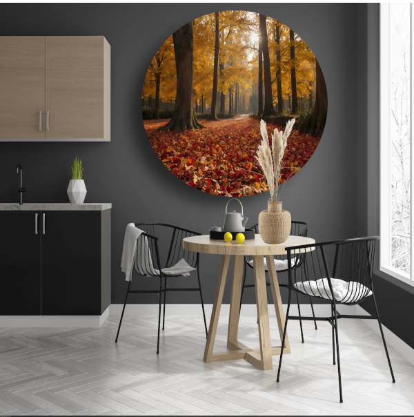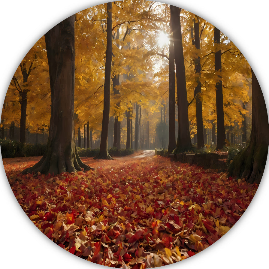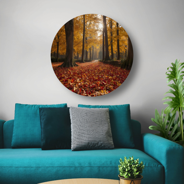 Herfstbladeren en Zonnestralen in het Bos aluminium muurcirkel