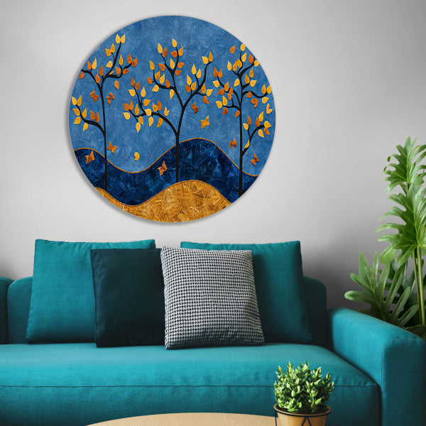 De afbeelding van de herfstbomen op de kleurrijke blauwe achtergrond zorgt voor een warme en sfeervolle uitstraling in ieder interieur. Of je nu een woonkamer, slaapkamer of kantoor wilt opfleuren, deze muurcirkel past perfect in elke ruimte.