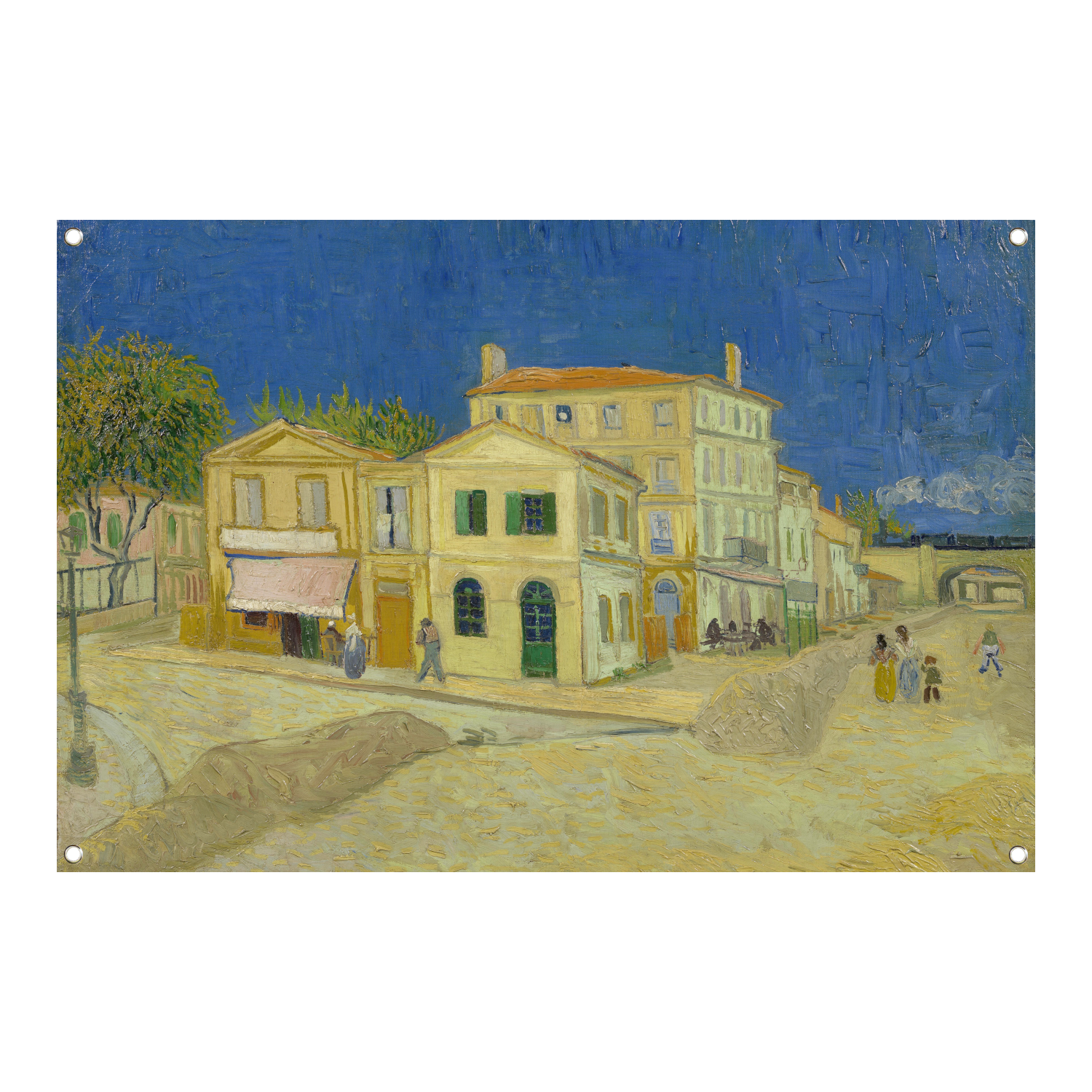 De kleuren van de tuinposter zijn levendig en helder, net als in het originele schilderij. Het gele huis springt eruit tegen de blauwe lucht en groene bomen, waardoor een prachtig contrast ontstaat. Dit zorgt voor een vrolijke en zomerse sfeer in jouw tuin.