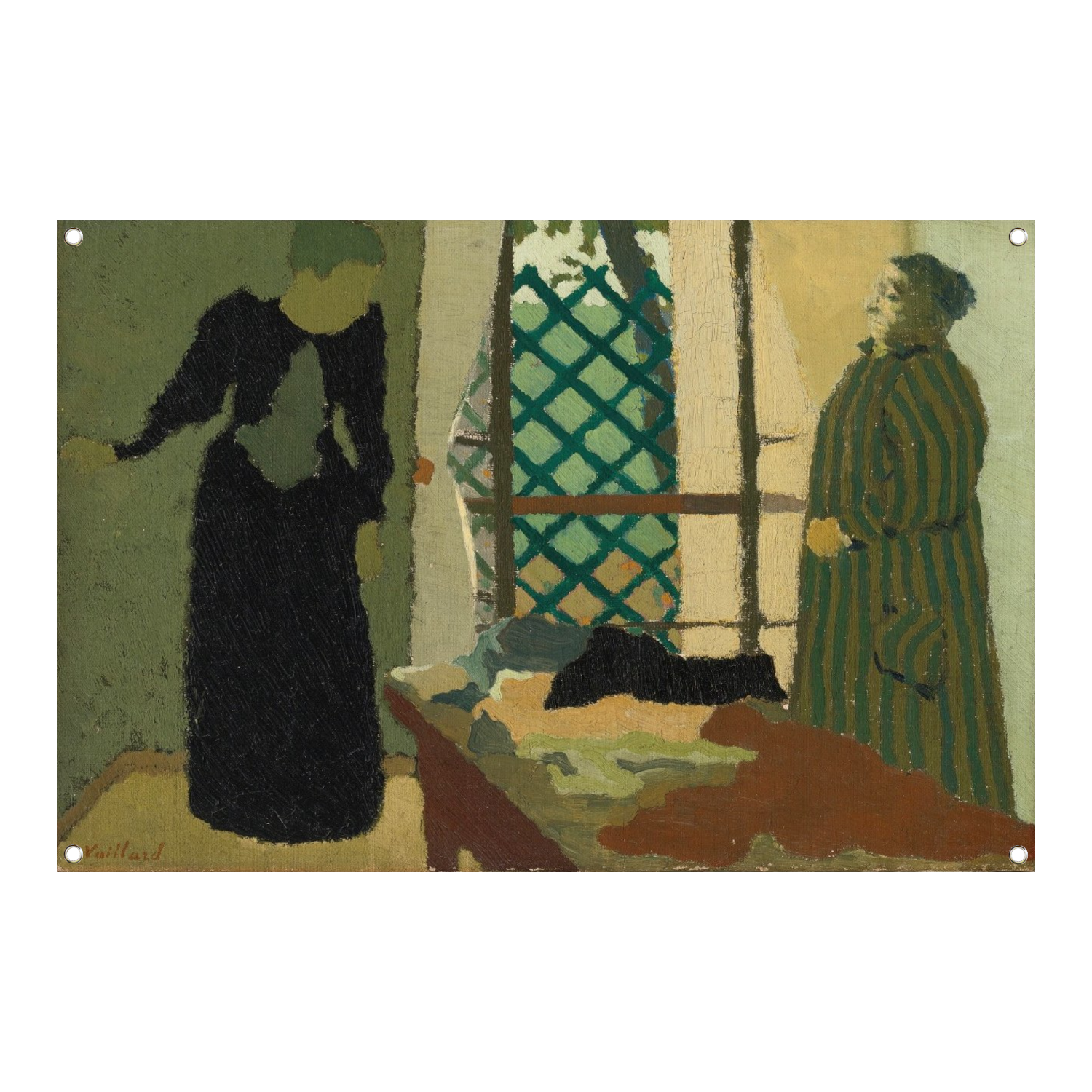 Deze prachtige liggende tuinposter is geïnspireerd op het beroemde schilderij van Édouard Vuillard, genaamd 'Het Naaiatelier van Madame Vuillard'. Het schilderij toont een intiem tafereel van een naaikamer, waarin de vrouw des huizes bezig is met haar handwerk. De kleuren zijn zacht en warm, met een vleugje roze en groen, wat zorgt voor een rustgevende sfeer.