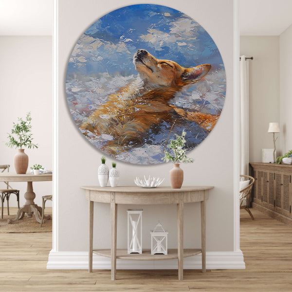 Breng een vleugje natuur en vreugde in huis met deze prachtige muurcirkel en geniet elke dag van het mooie tafereel van deze gelukkige hond in de sneeuw en zon.
