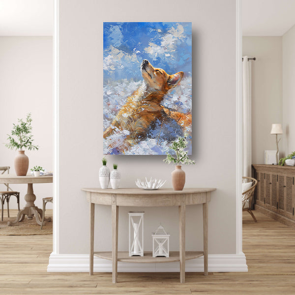 Hond genietend van de sneeuw en zon canvas met baklijst