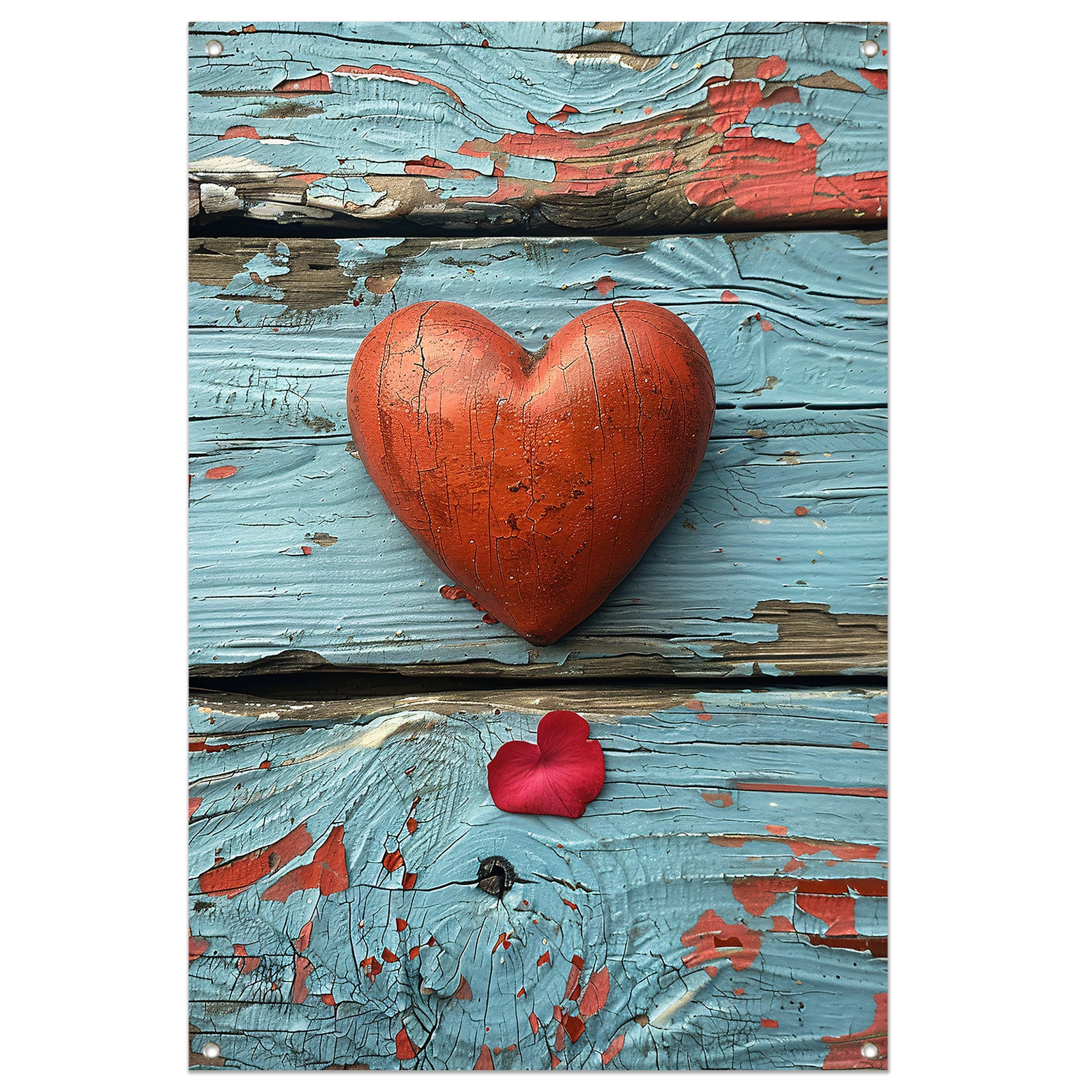 Houten Hart en Rozenblaadje op Verweerd Hout tuinposter