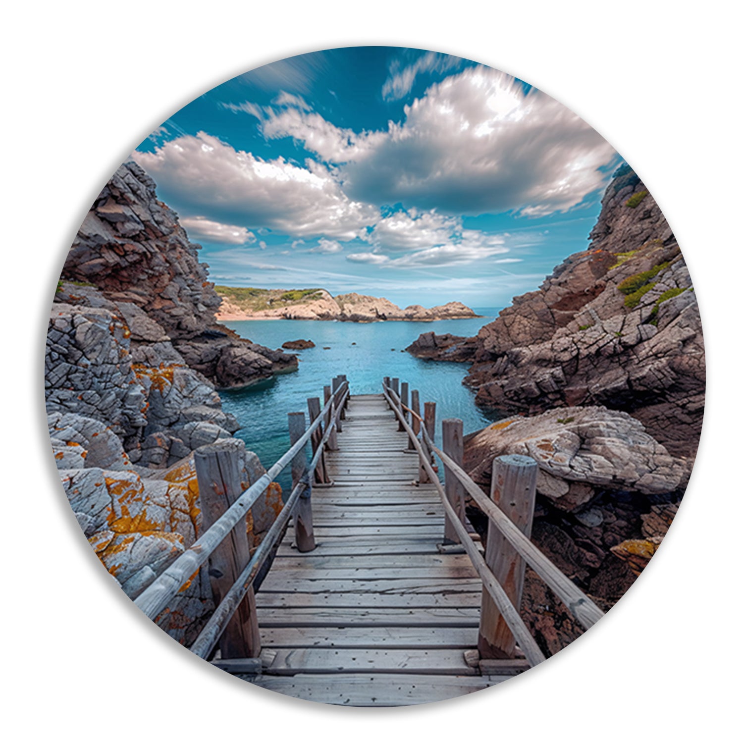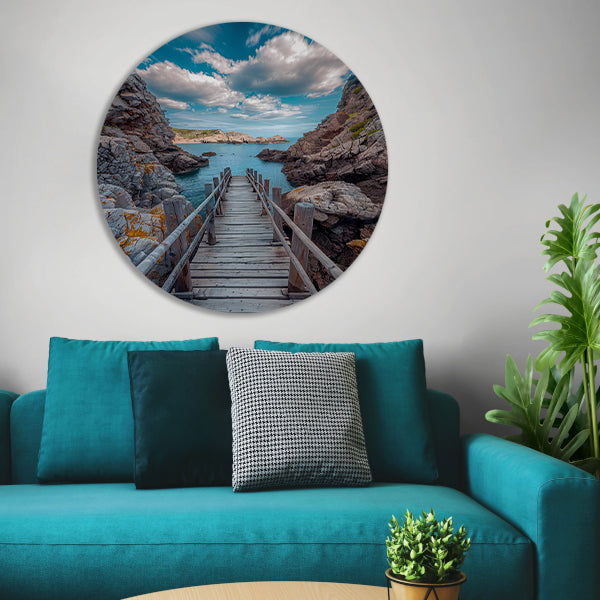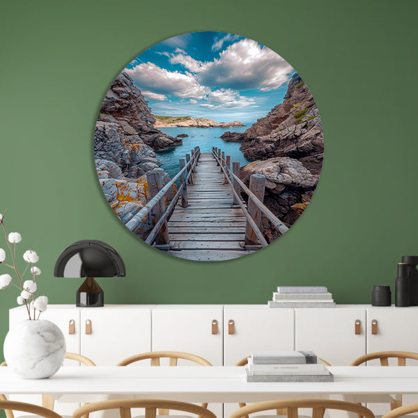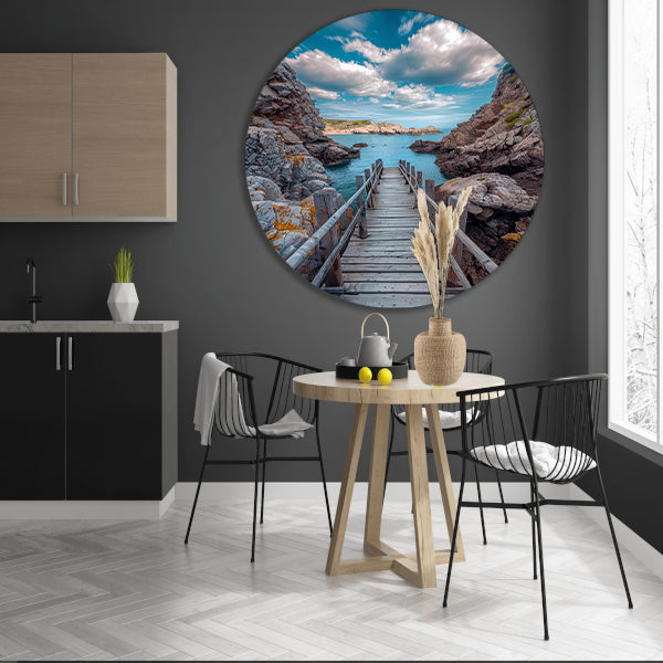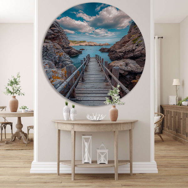 Houten loopbrug naar zee omringd door rotsen forex muurcirkel