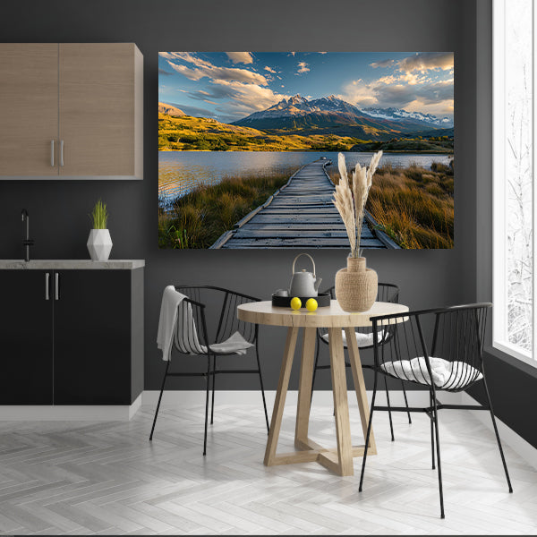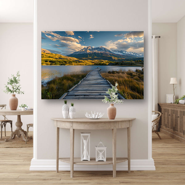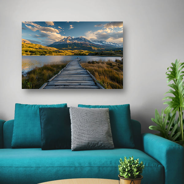 Houten pad naar bergen in schitterend landschap canvas met baklijst