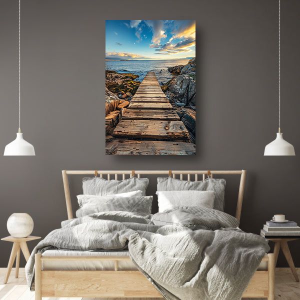 Houten pier bij zonsondergang met dramatische wolken acrylglas