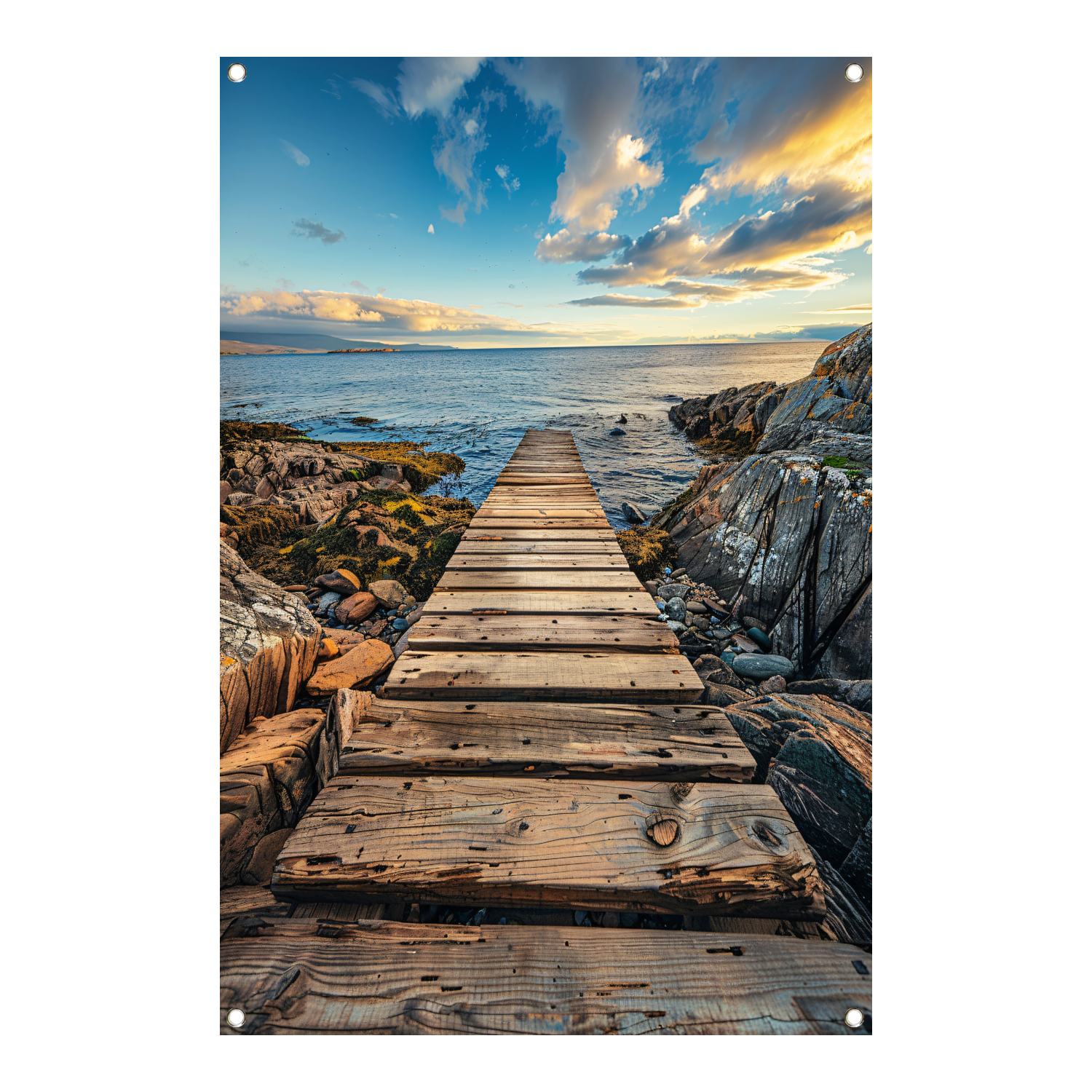 Houten pier bij zonsondergang met dramatische wolken tuinposter