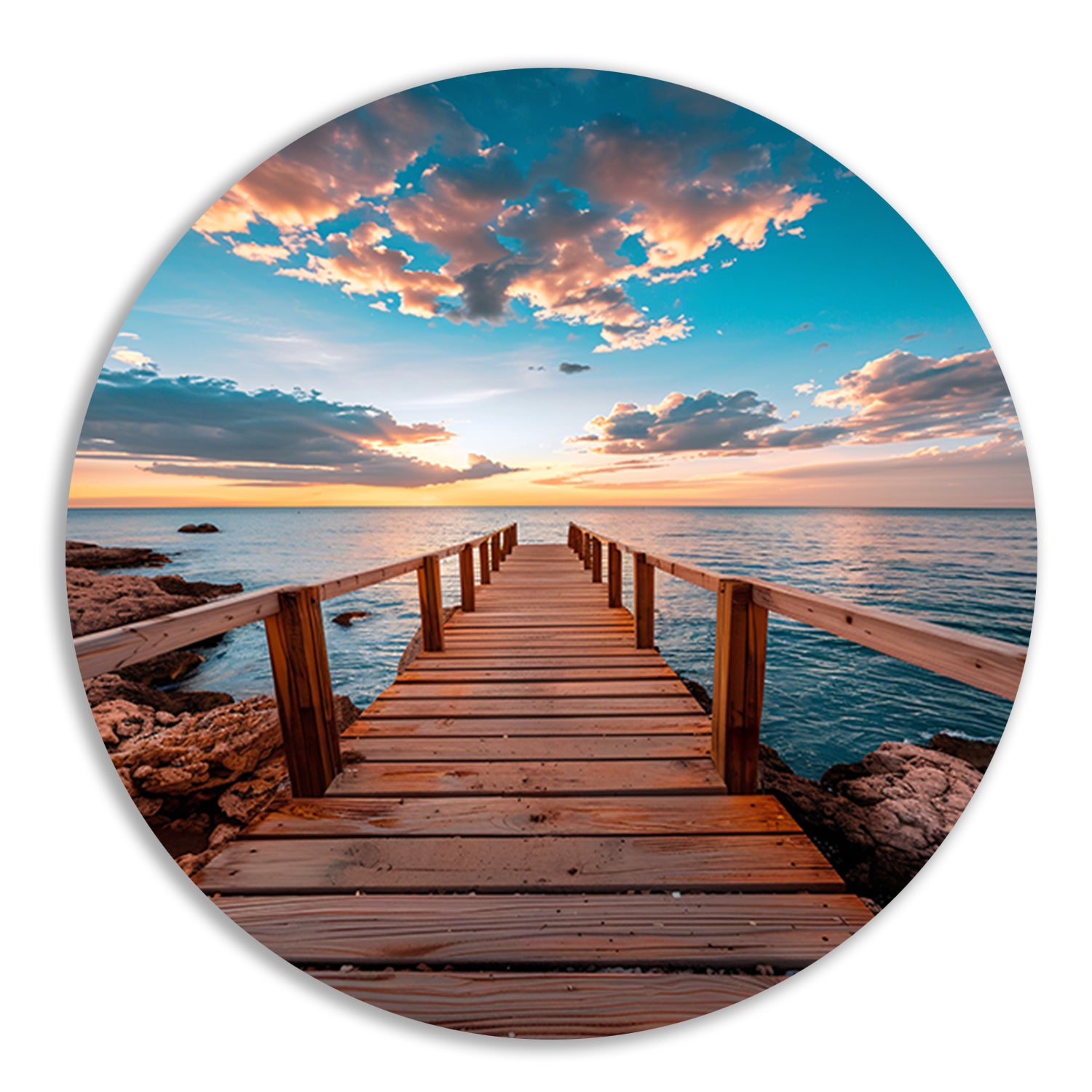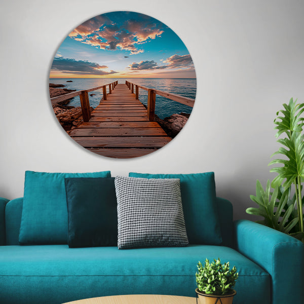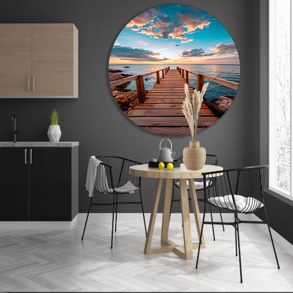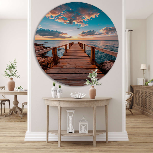 Houten steiger bij zonsondergang, rustgevend zeezicht forex muurcirkel