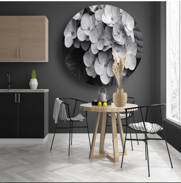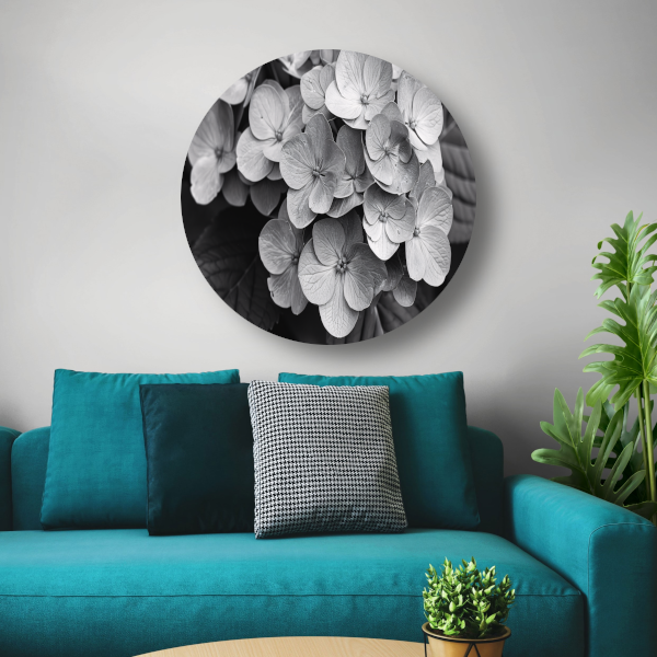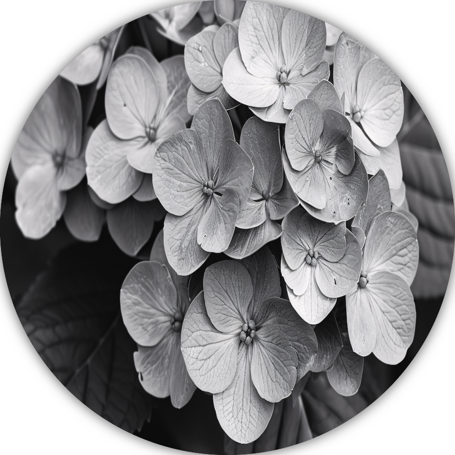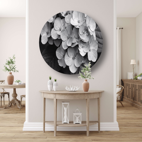 Hydrangea in Zwart-Wit aluminium muurcirkel