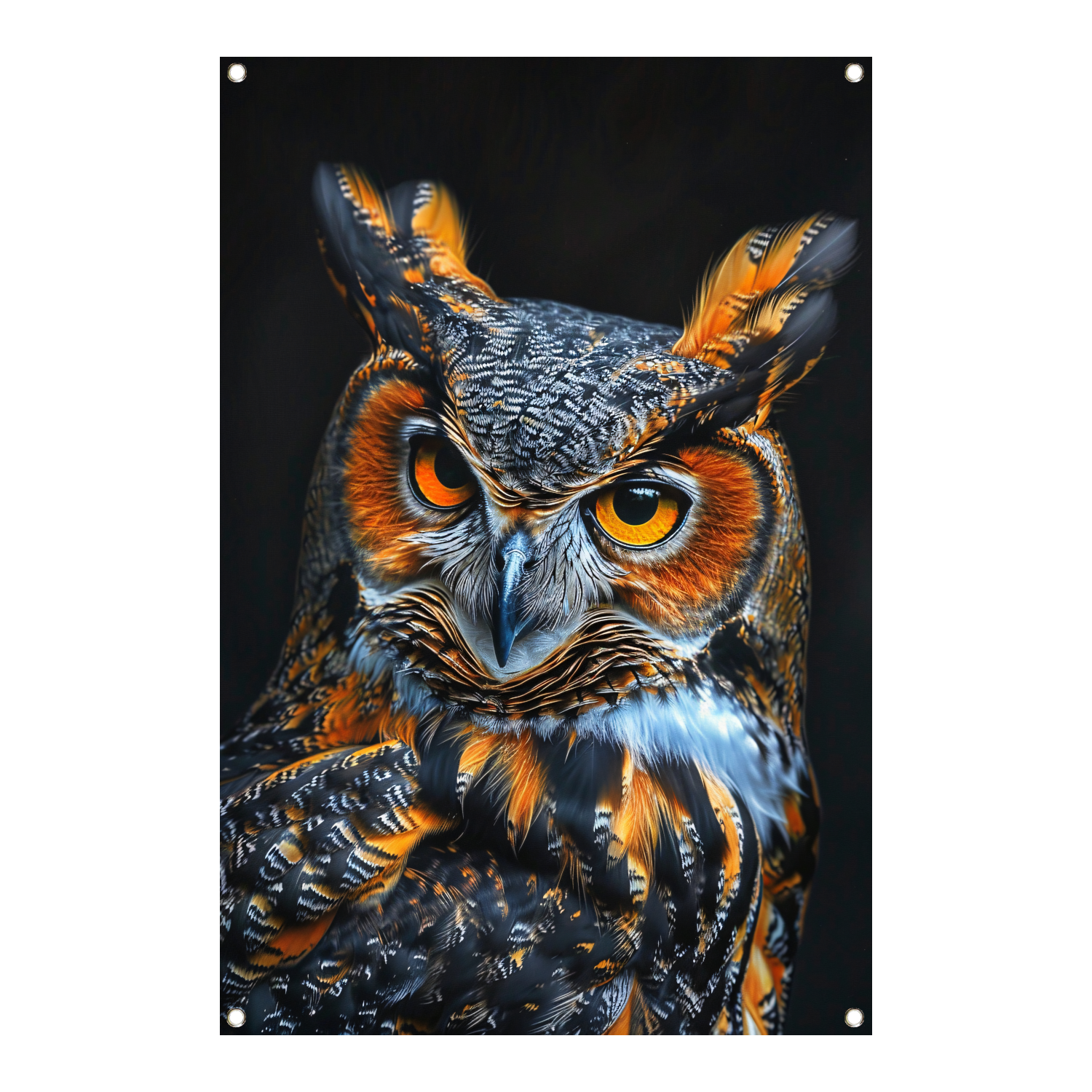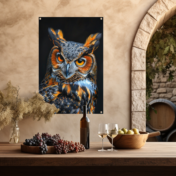 Hyperrealistische Uil met Intense Ogen en Kleurrijke Veren tuinposter