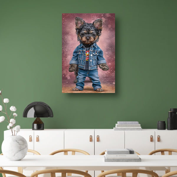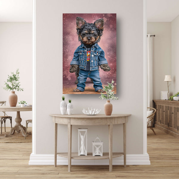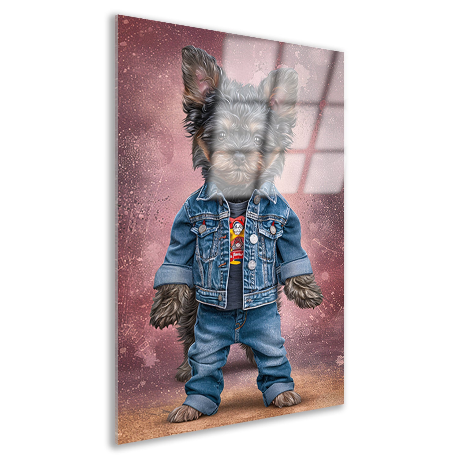 Hyperrealistische Yorkshire Terriër in spijkerjas acrylglas