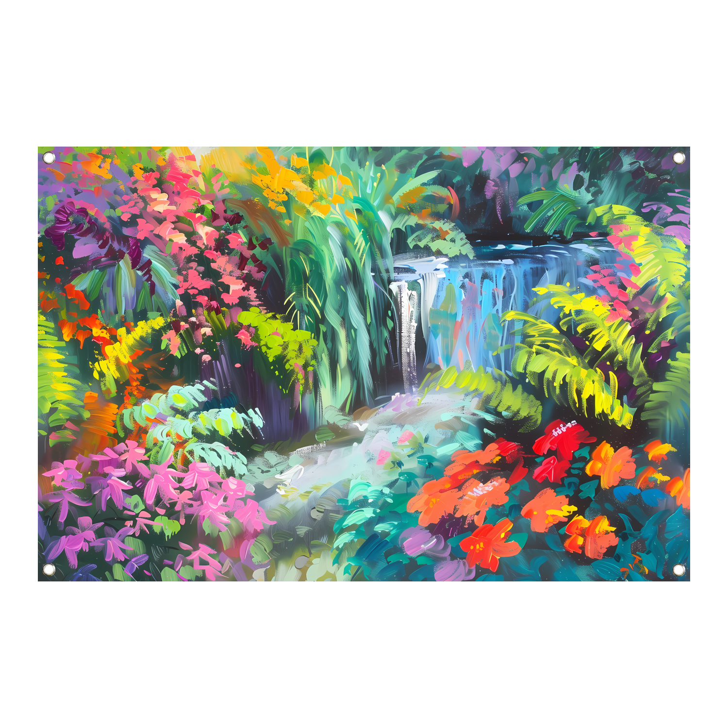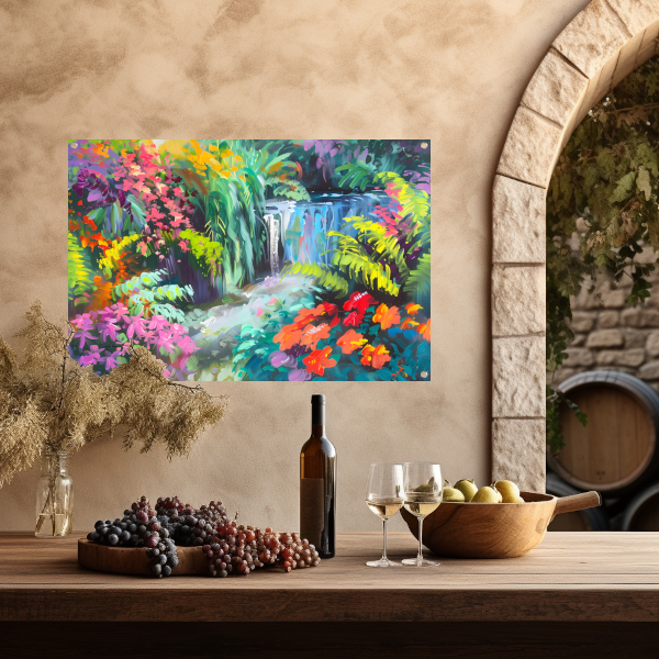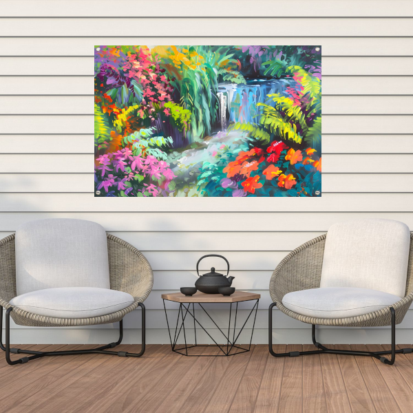 Impressionistische waterval met kleurrijke bloemenpracht tuinposter