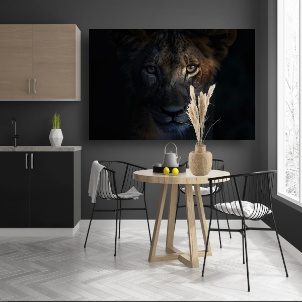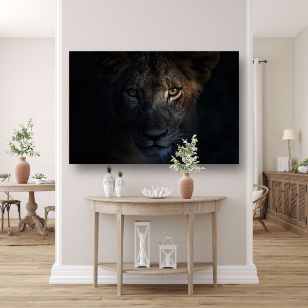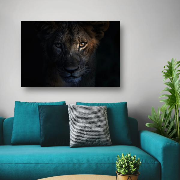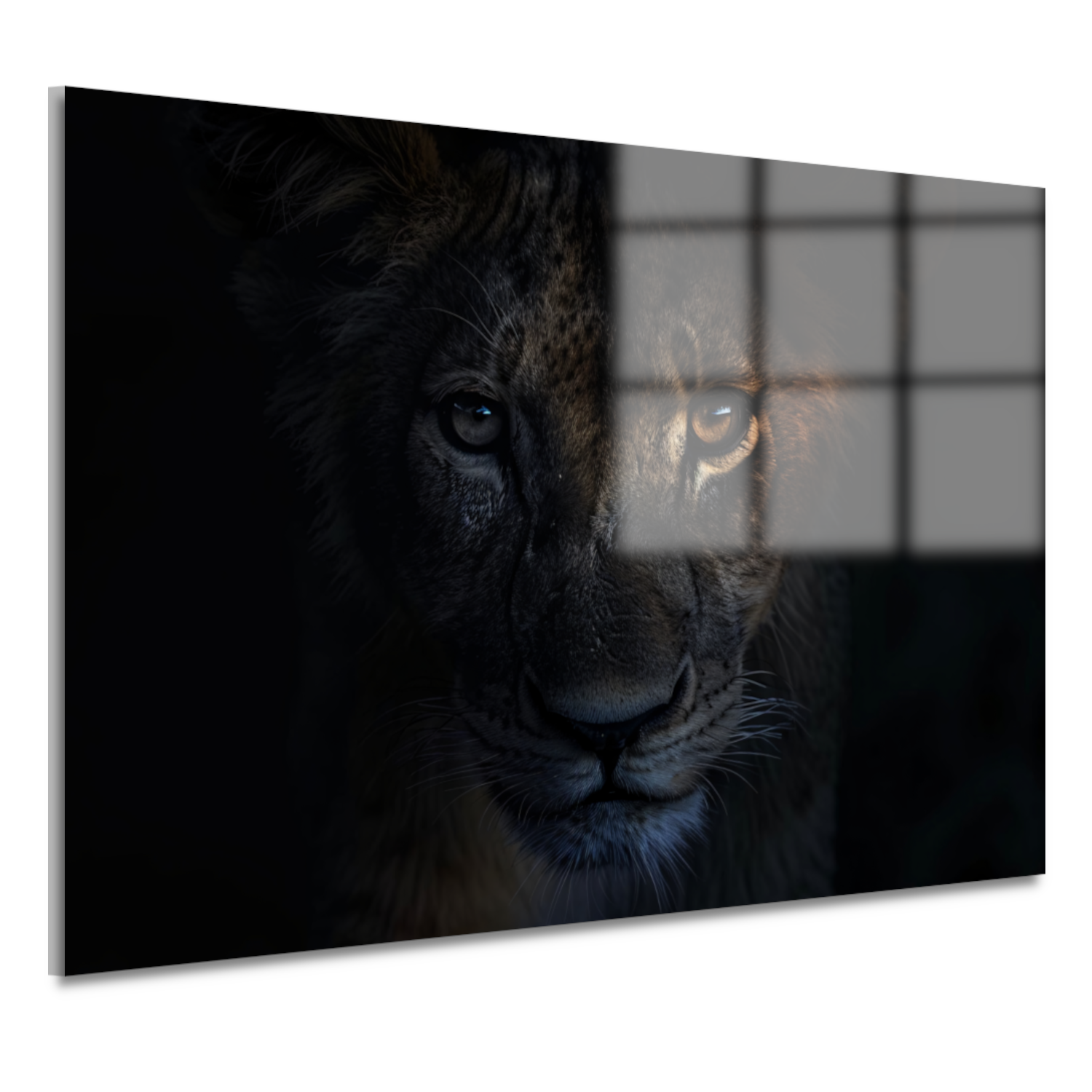 Indringende leeuwenblik in schemerige duisternis acrylglas