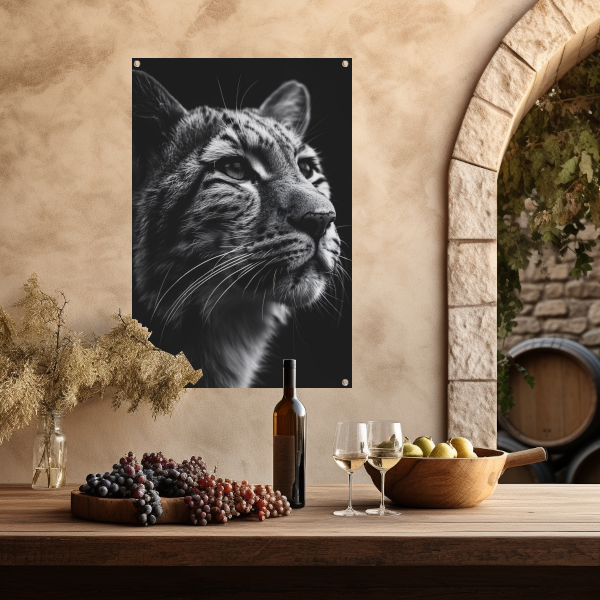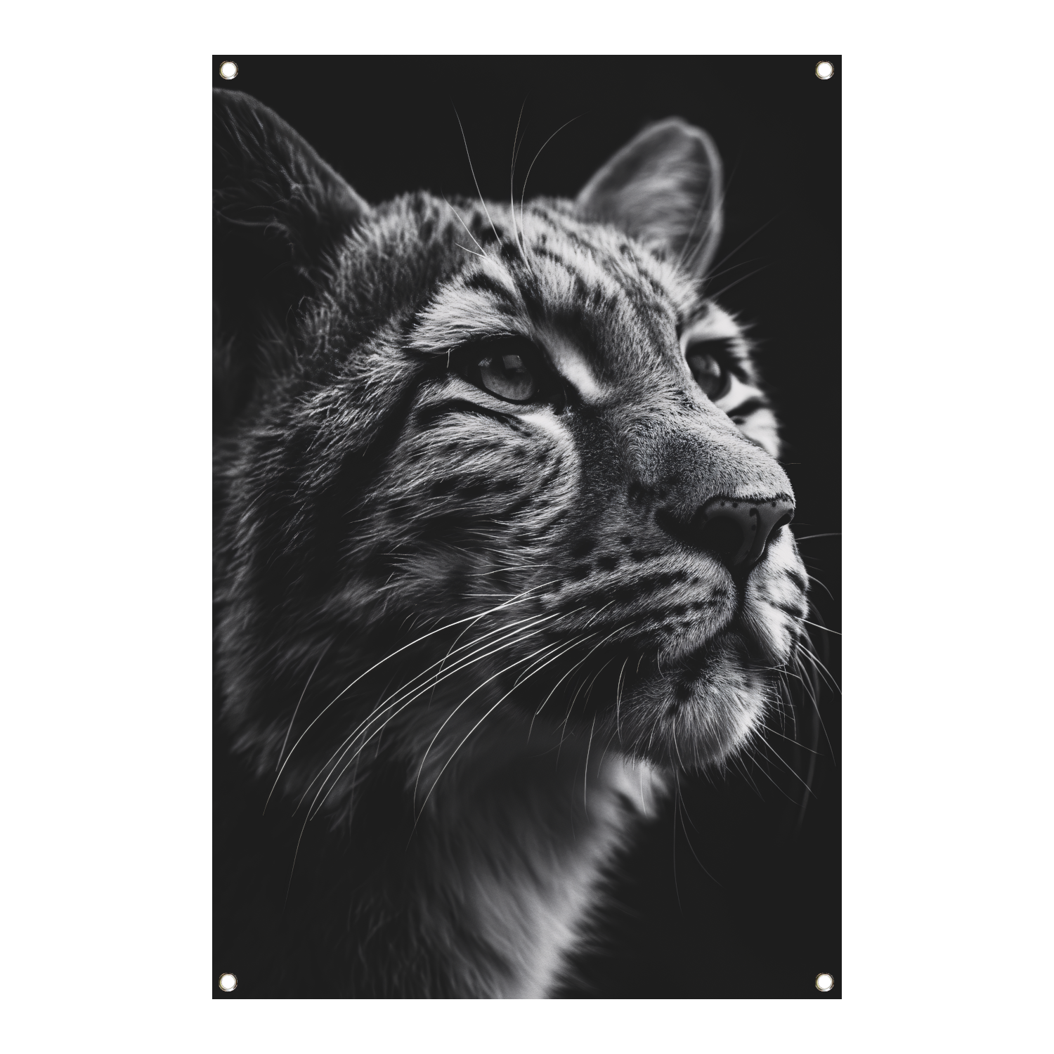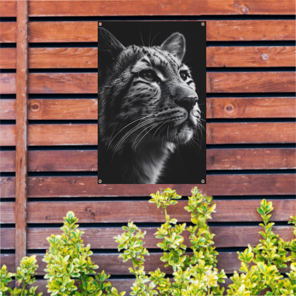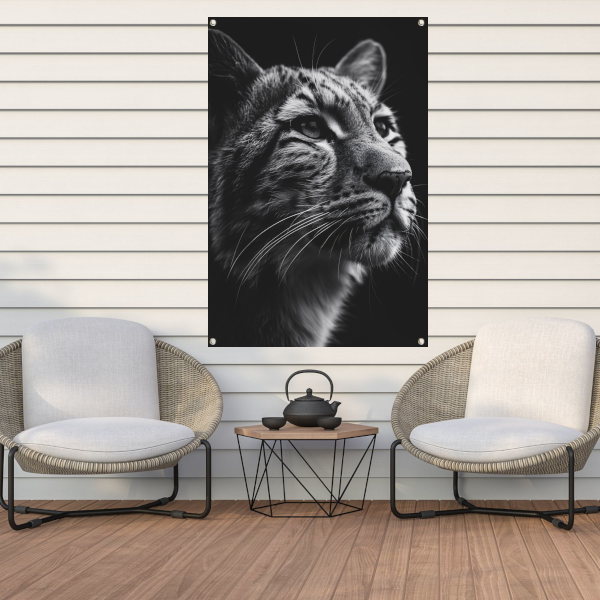 Indrukwekkend zwart-wit close-up portret van een luipaard tuinposter