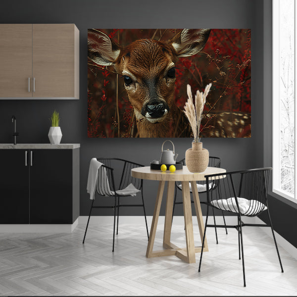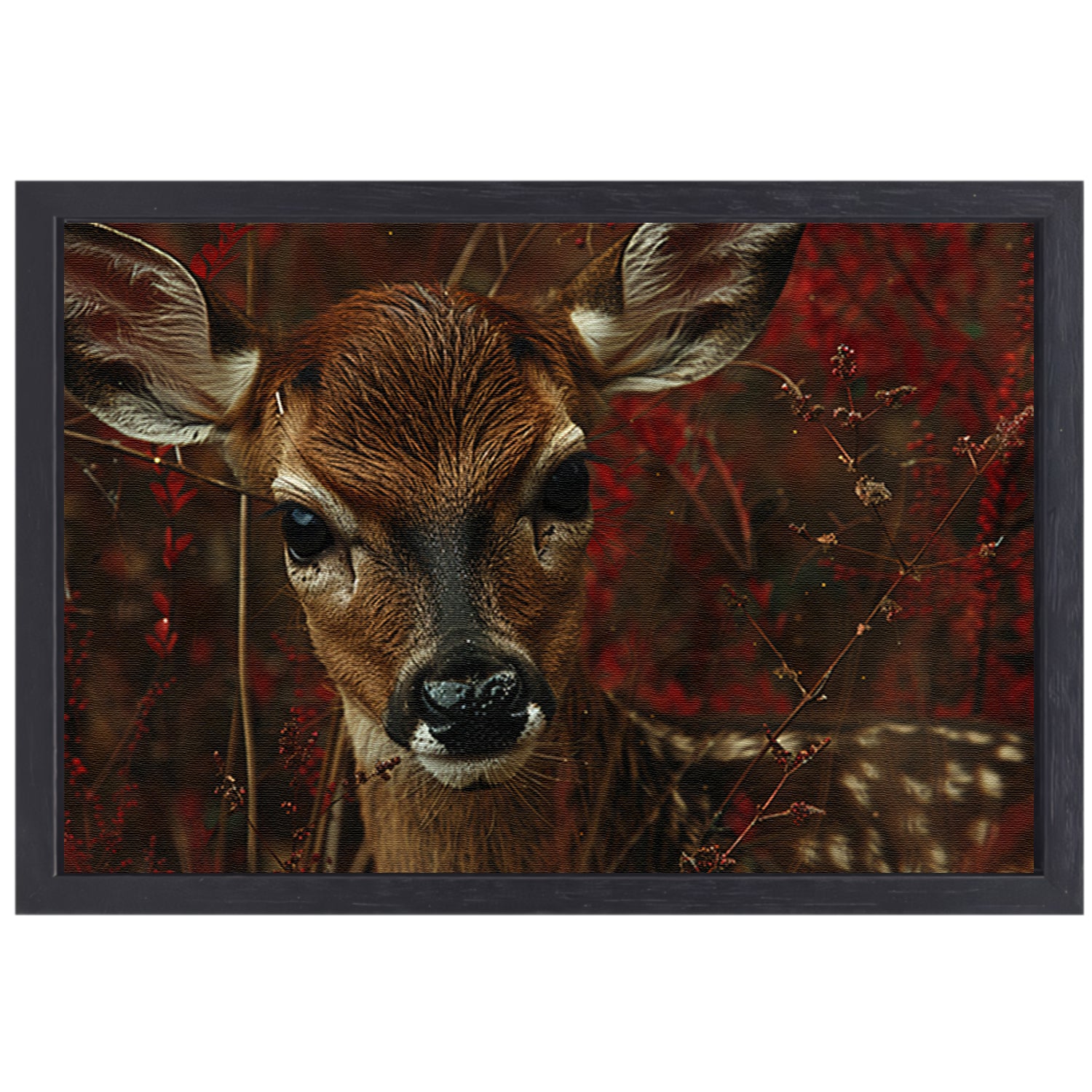 Jong hert verborgen tussen herfstbladeren canvas met baklijst