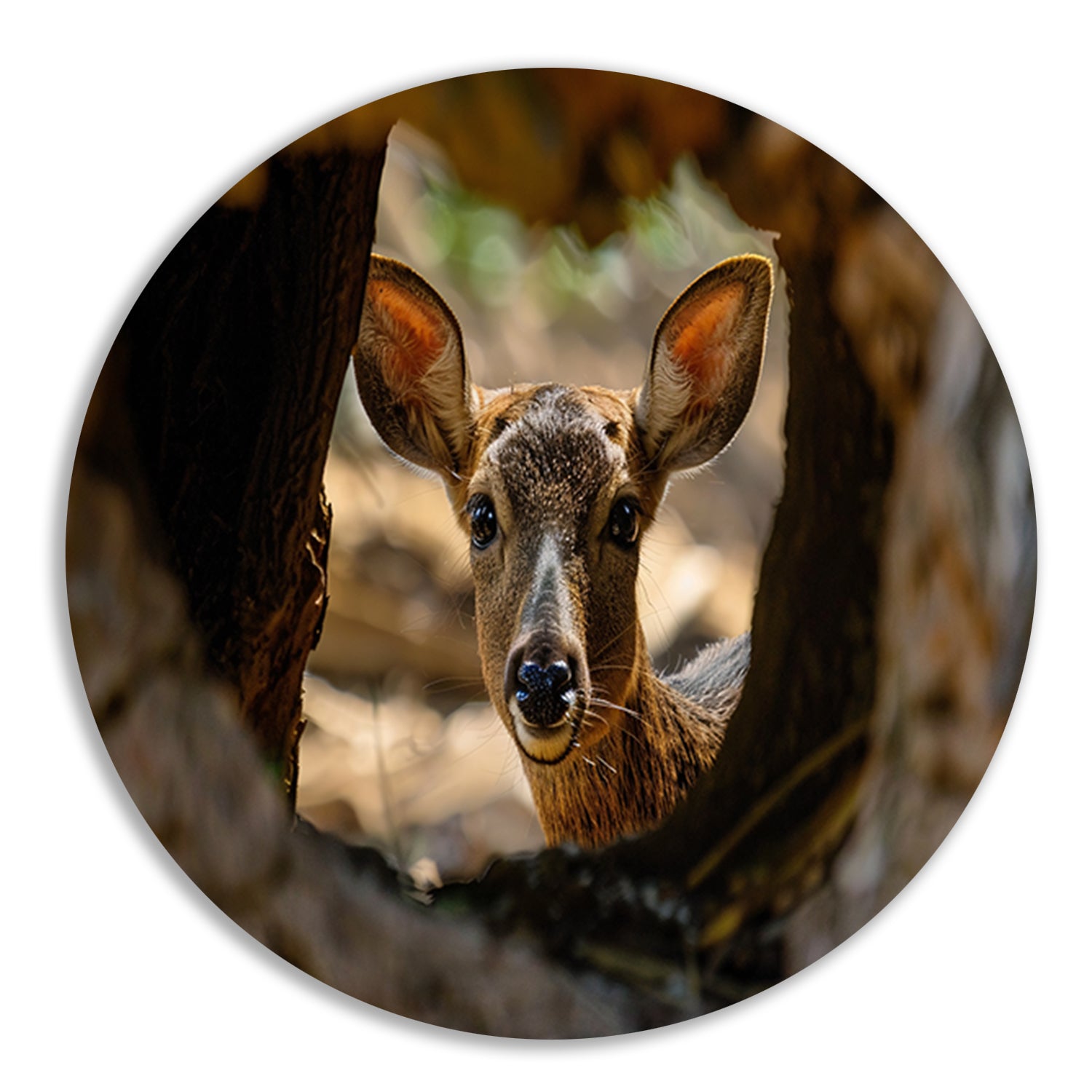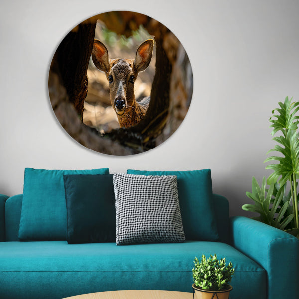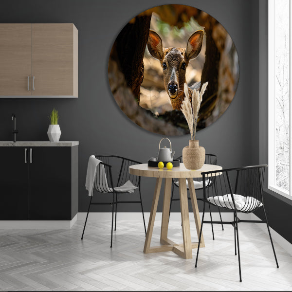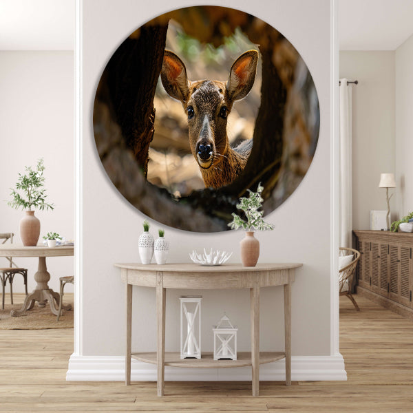Jonge hert kijkt nieuwsgierig uit boom forex muurcirkel