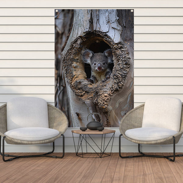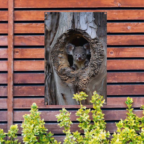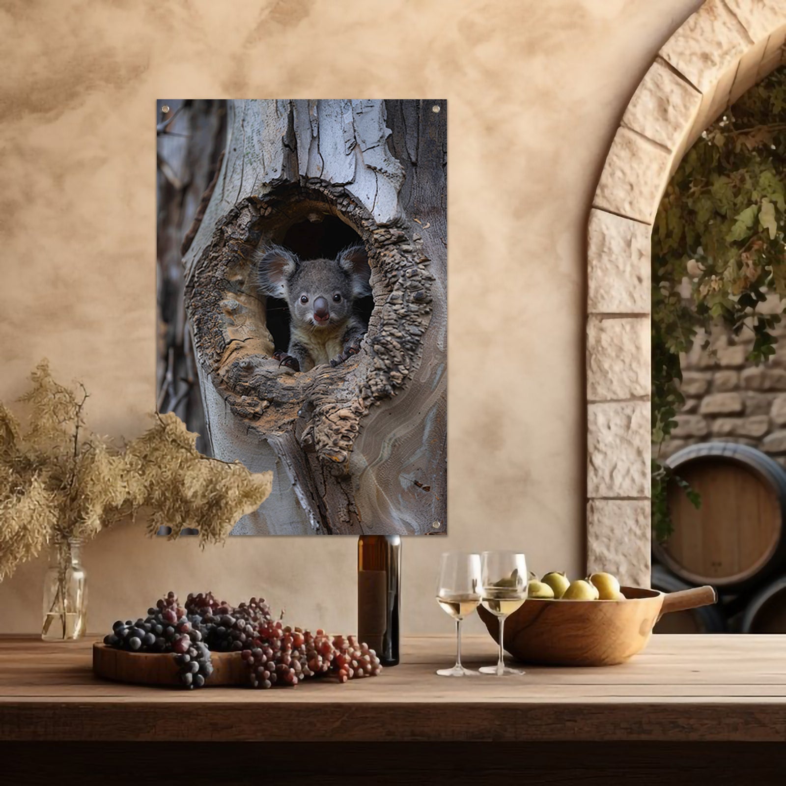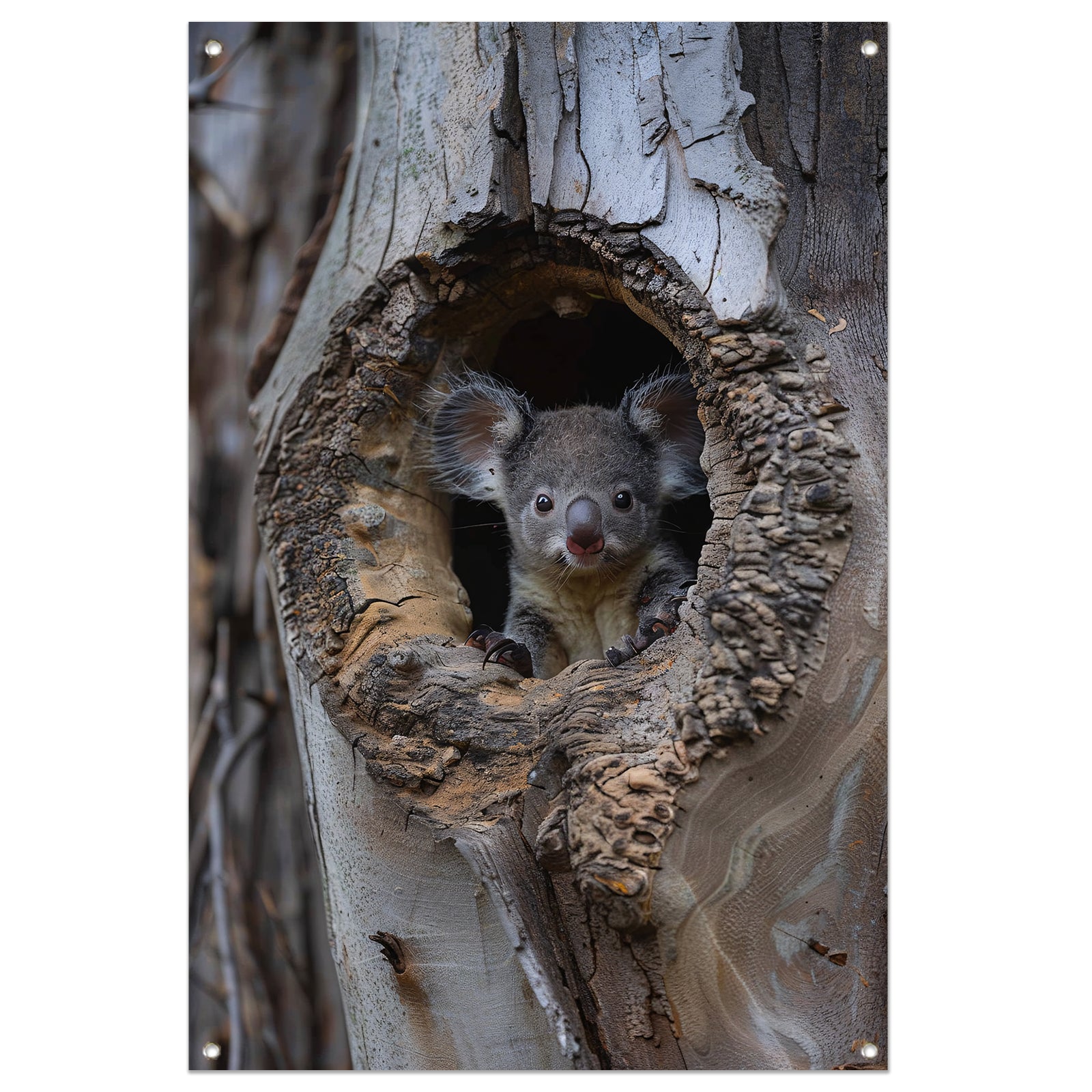 Jonge Koala Verkent de Wereld vanuit Boomholte tuinposter