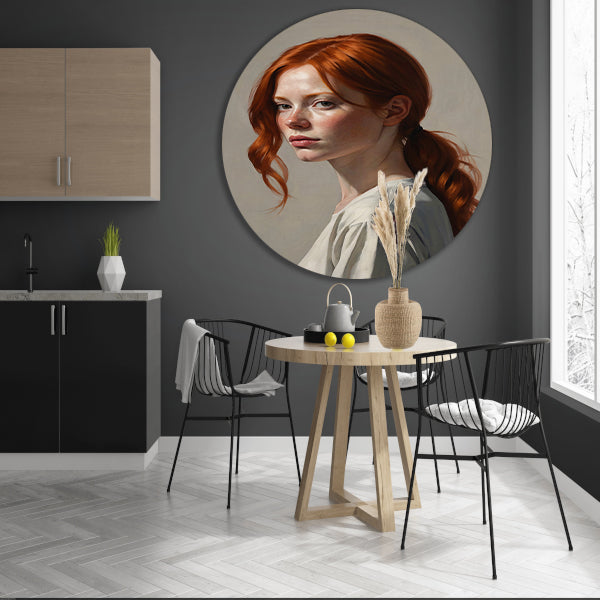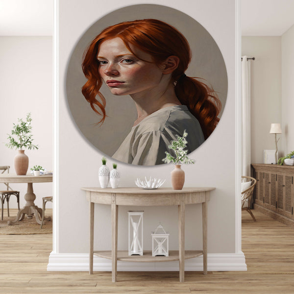 Jonge vrouw met rood haar en sproeten aluminium muurcirkel