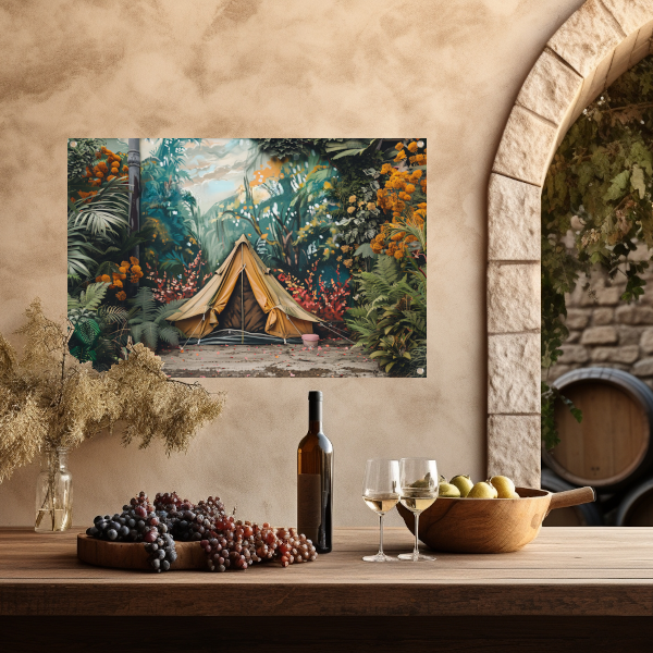 Kampeertent in een dromerig kleurrijk bos tuinposter