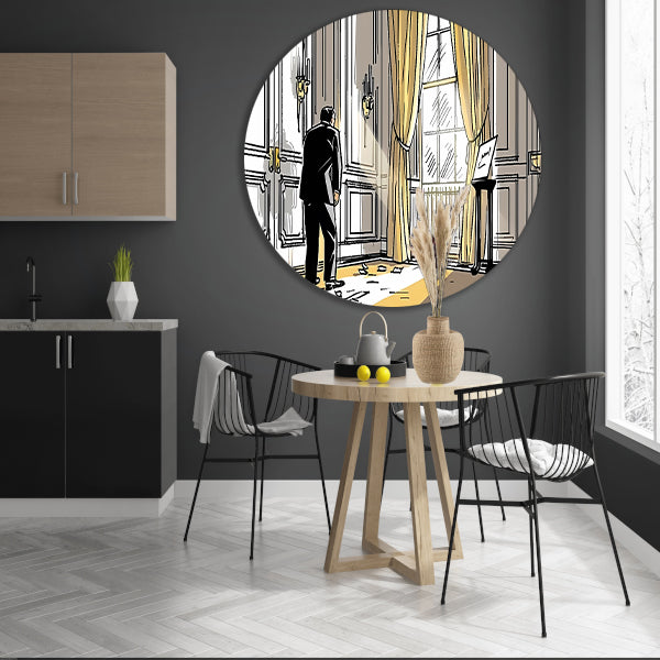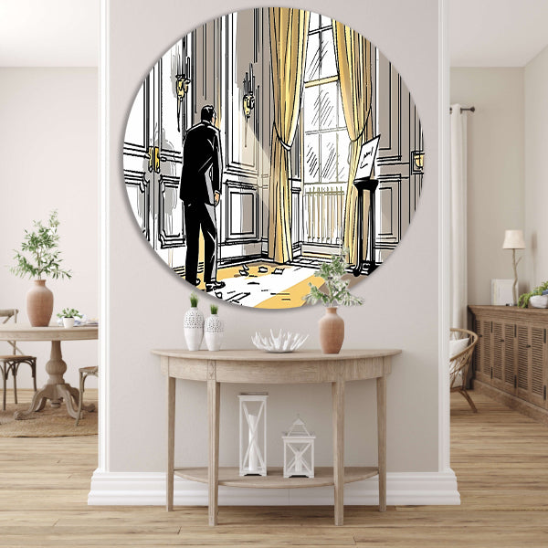 Voeg een vleugje kunst en elegantie toe aan jouw interieur met deze prachtige klassieke line art tekening van een man op een aluminium muurcirkel.