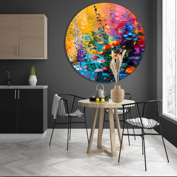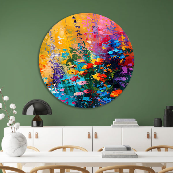 Kleurrijk abstract bloemenweide schilderij aluminium muurcirkel