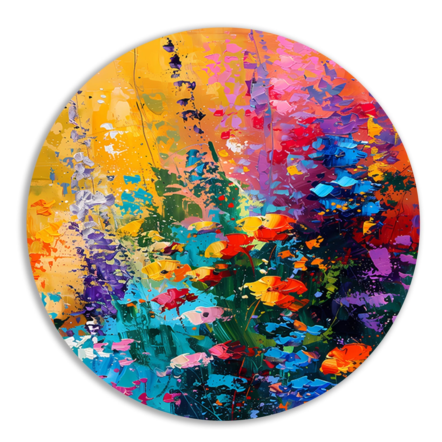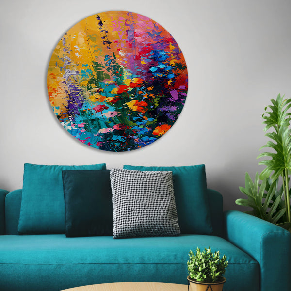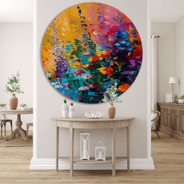 Breng kleur en leven in je interieur met dit prachtige kleurrijke abstracte bloemenweide schilderij op forex muurcirkel. Een eyecatcher in elke ruimte!