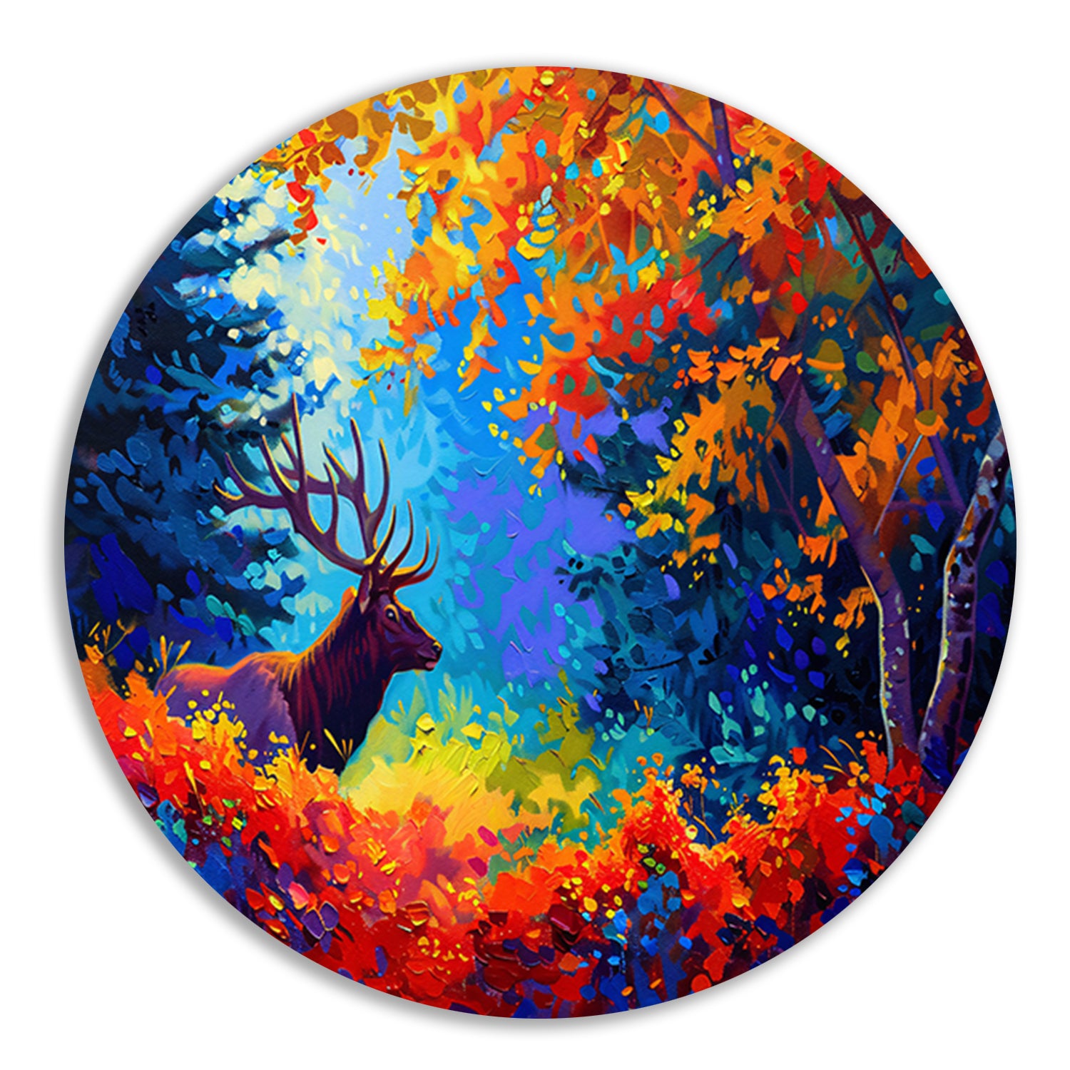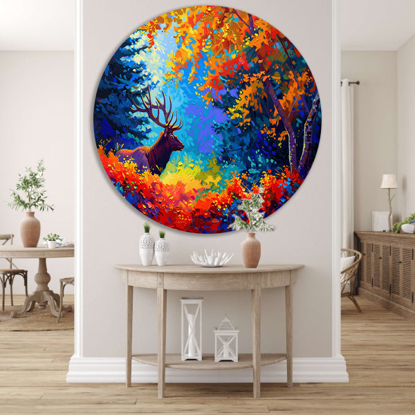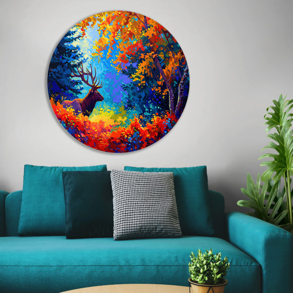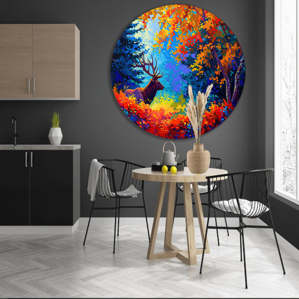 Kleurrijk abstract hert in bos aluminium muurcirkel