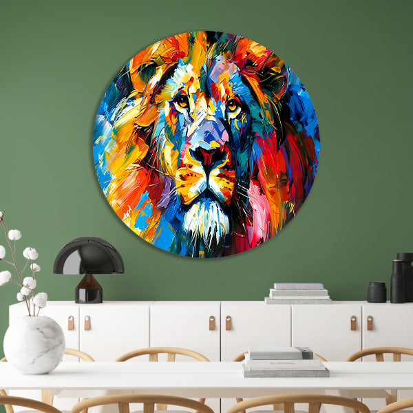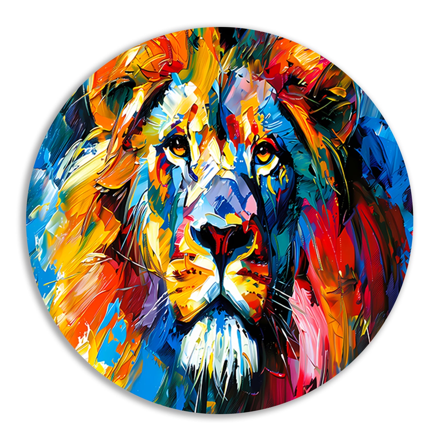 Kleurrijk abstract leeuw schilderij voor interieur aluminium muurcirkel