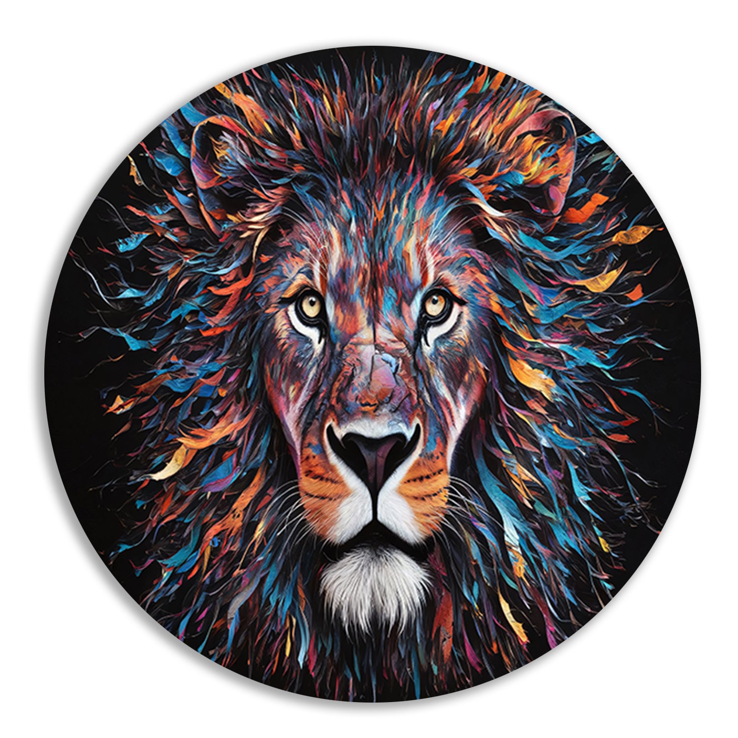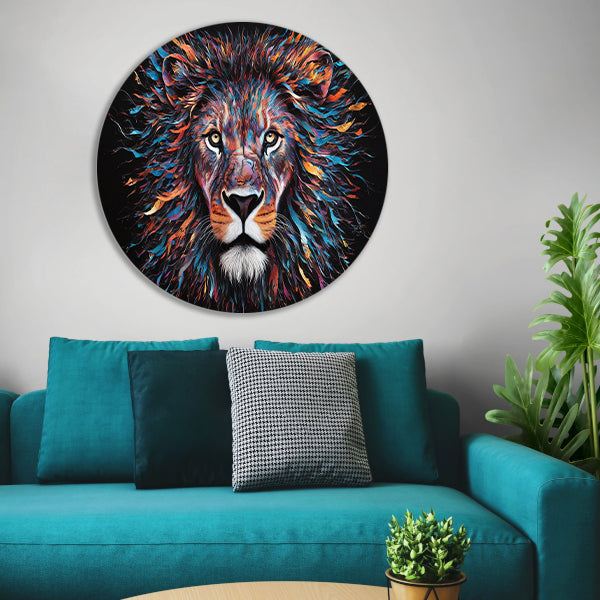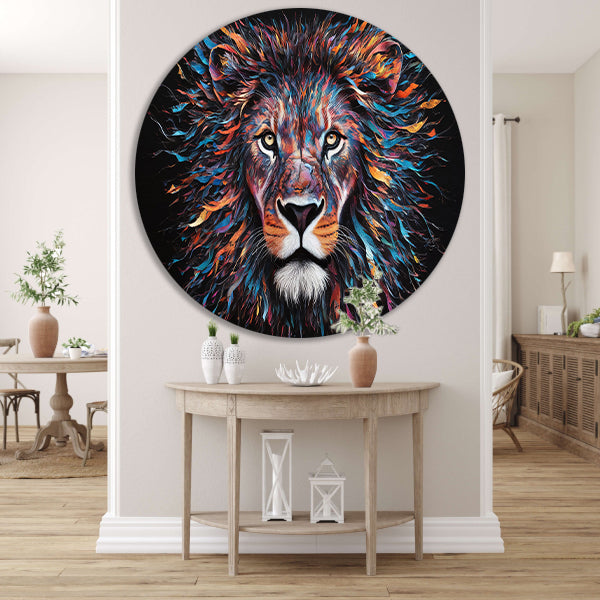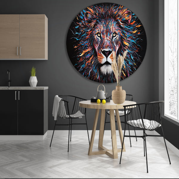 Kleurrijk abstract leeuwenportret met dynamische kleuren forex muurcirkel