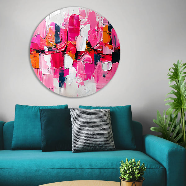 Kleurrijk abstract schilderij met dynamische vormen aluminium muurcirkel