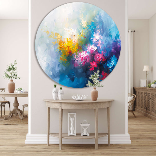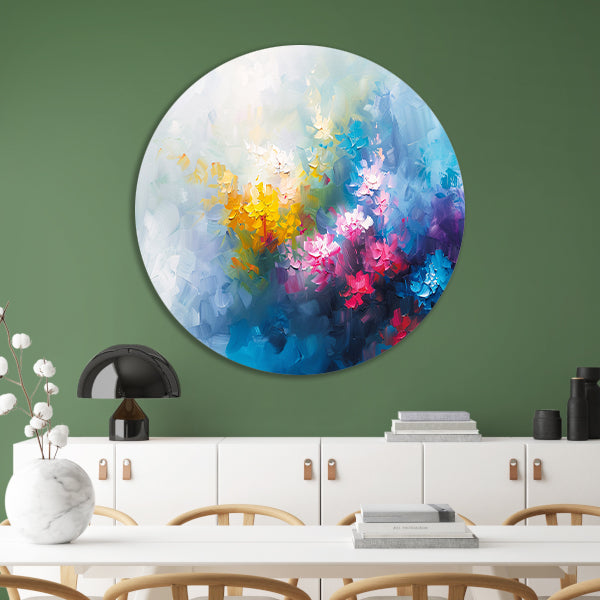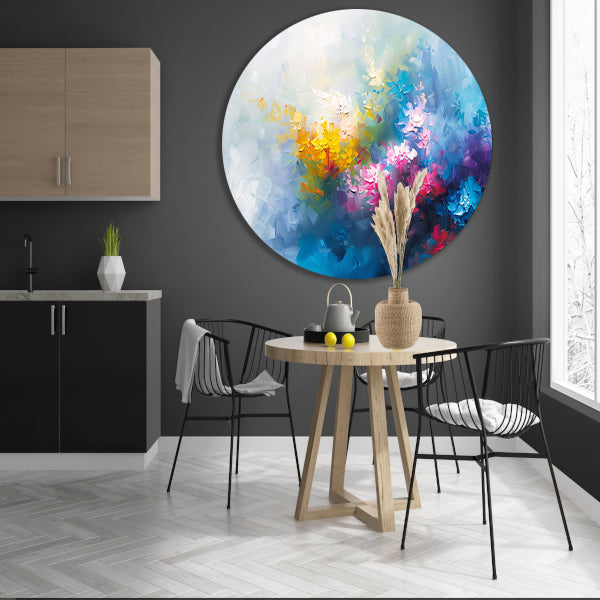 Kleurrijk abstract schilderij van bloemenveld aluminium muurcirkel