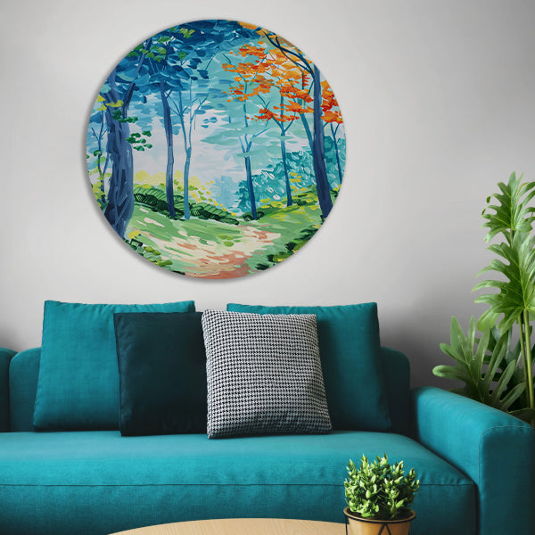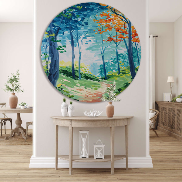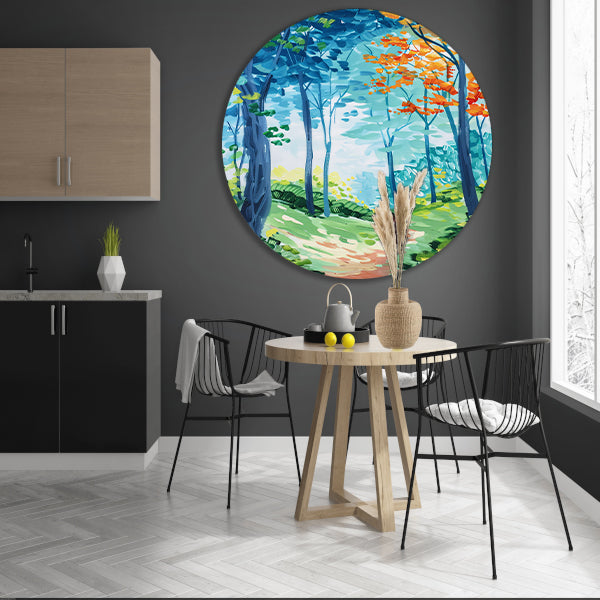 Of je nu houdt van abstracte kunst, natuurlijke landschappen of gewoon op zoek bent naar een blikvanger voor aan de muur, dit kleurrijke abstracte schilderij van een boslandschap op een aluminium muurcirkel zal zeker indruk maken op iedereen die jouw huis bezoekt. Voeg dit kunstwerk toe aan je interieur en creëer een unieke en sfeervolle ambiance in elke ruimte.