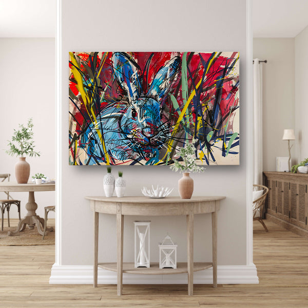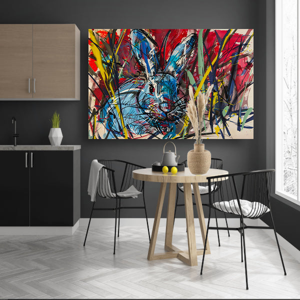 Kleurrijk abstract schilderij van een konijn canvas met baklijst