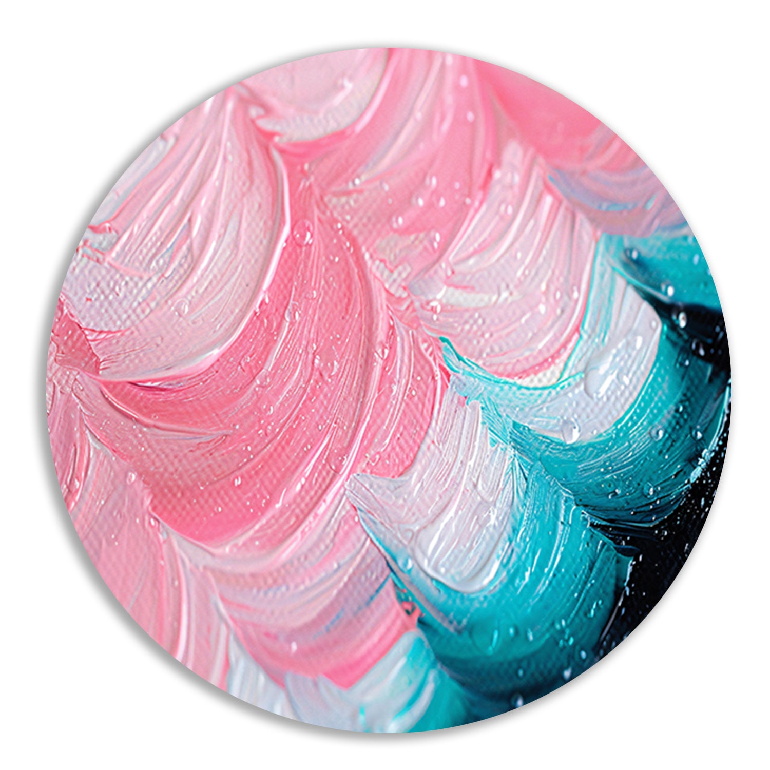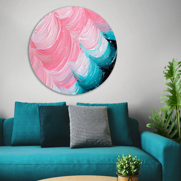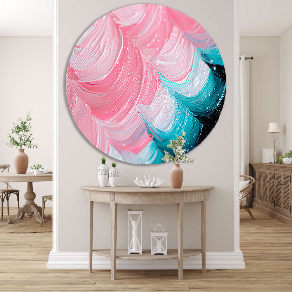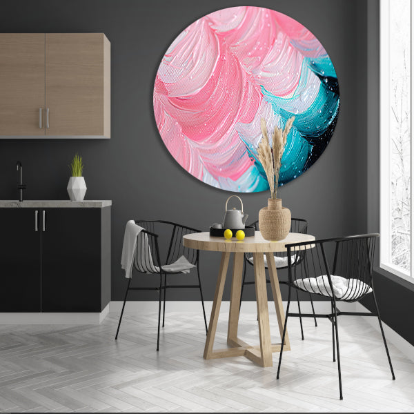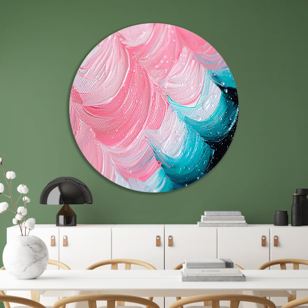 Voeg dit prachtige kleurrijke abstracte waterval schilderij op forex muurcirkel toe aan jouw interieur en geniet van de levendige kleuren en de moderne uitstraling die het met zich meebrengt. Perfect voor liefhebbers van abstracte kunst en moderne interieurs!
